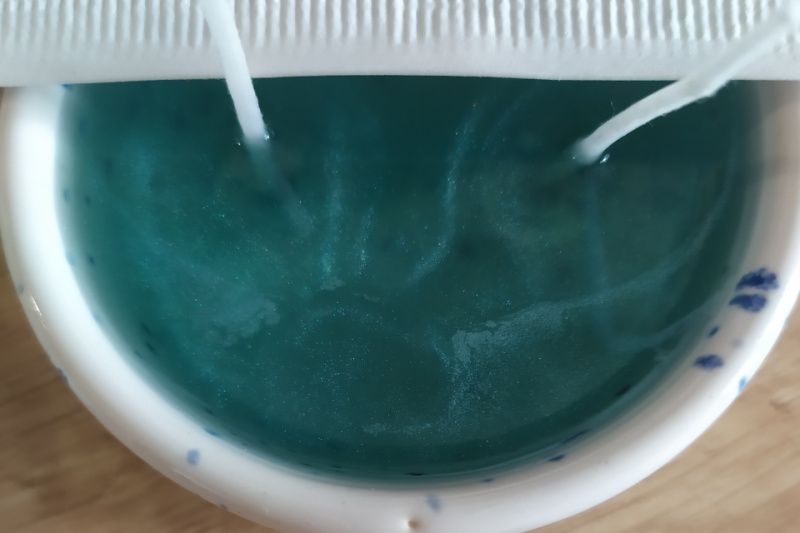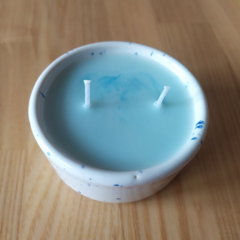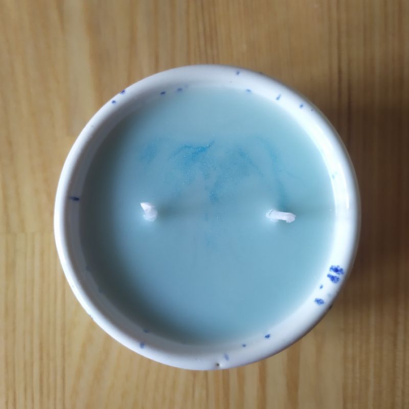 Свеча с естественными блестками слюды, воск соевый, на два фитиля, аромат ваниль-японская вишня, 55 мл воска. Свеча хорошо подходит, как медитативная, или к романтическому вечеру дома. Свеча в керамическом подсвечнике бело-синего цвета.