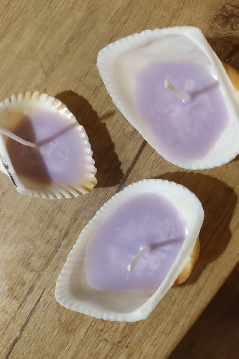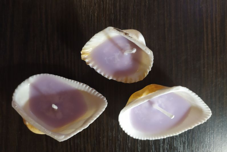 Свечи в раковинах сделаны из смеси пальмового и соевого воска, эфирные масла лимон, апельсин, имбирь, фиолетовый краситель. Запах легкий, цитрусовый. Такие свечи являются новым мировым трендом, поскольку люди больше заботятся об экологичности, а раковины являются естественным материалом. После использования таких свеч остается милый сувенир. Горение 30-40 мин в зависимости от наполнения свечи воском. Внимание: курить только под наблюдением на тарелке или в соответствующих широких подсвечниках.
