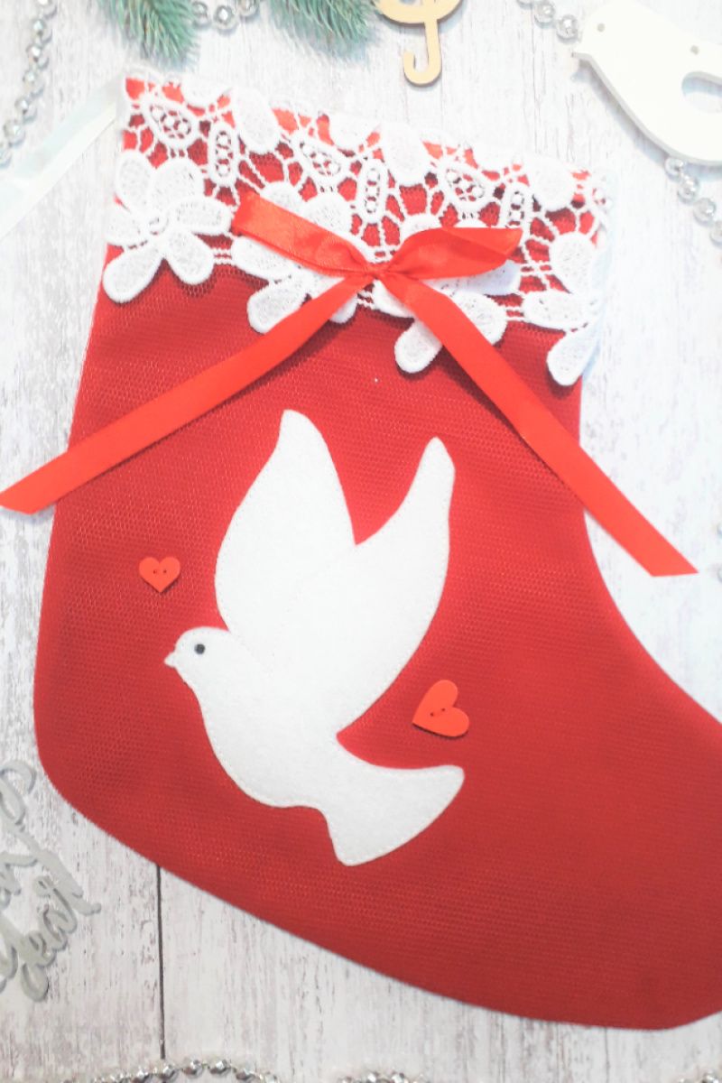 Новогодняя носок из ткани. Высота 28 см, ширина также 28 см, высота подвеса - 9 см. Изготовлена из ткани вручную и с помощью швейной машины. Носок декорирована аппликацией из фетра и других тканей. Можно использовать для оформления новогоднего и Рождественского интерьера или для подарков детям и взрослым на Новый год, праздник Николая. Также хорошая идея будет для корпоративного подарка на заказ. Есть возможность изготовить в любым именем на специальном ярлыке или сверху носки на заказ. При пожелании является праздничное упаковки.