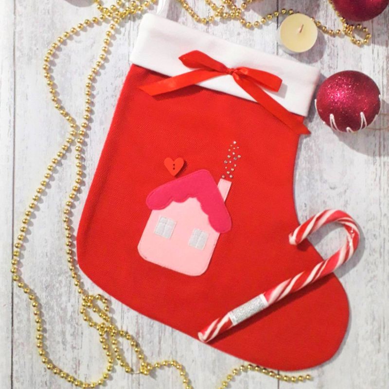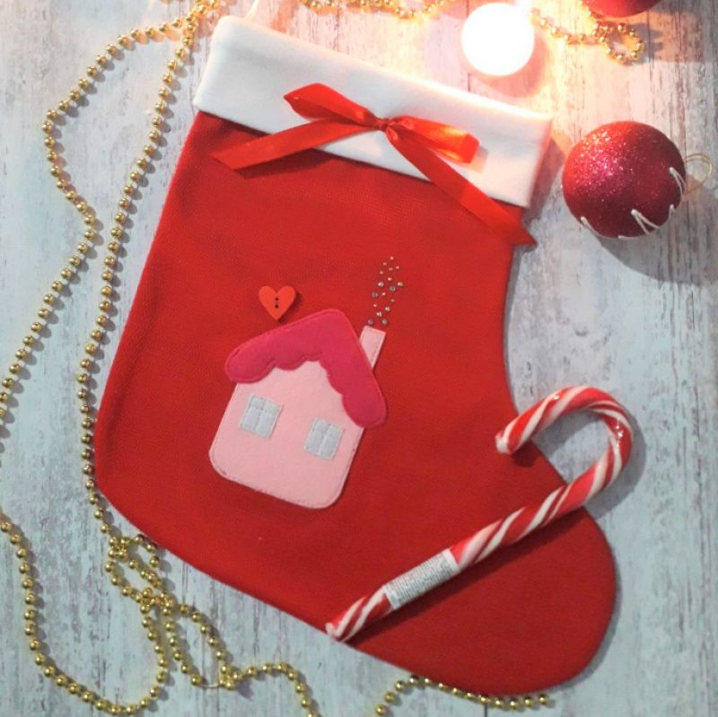 Новогодняя носок из ткани. Высота 28 см, ширина также 28 см, высота подвеса - 9 см. Изготовлена из фетра вручную и с помощью швейной машины. Носок декорирована аппликацией из фетра и других тканей. Можно использовать для оформления новогоднего и Рождественского интерьера или для подарков детям и взрослым на Новый год, праздник Николая. Также хорошая идея будет для корпоративного подарка на заказ. Есть возможность изготовить в любым именем на специальном ярлыке или в верху носки на заказ. При пожелании является праздничное упаковки.