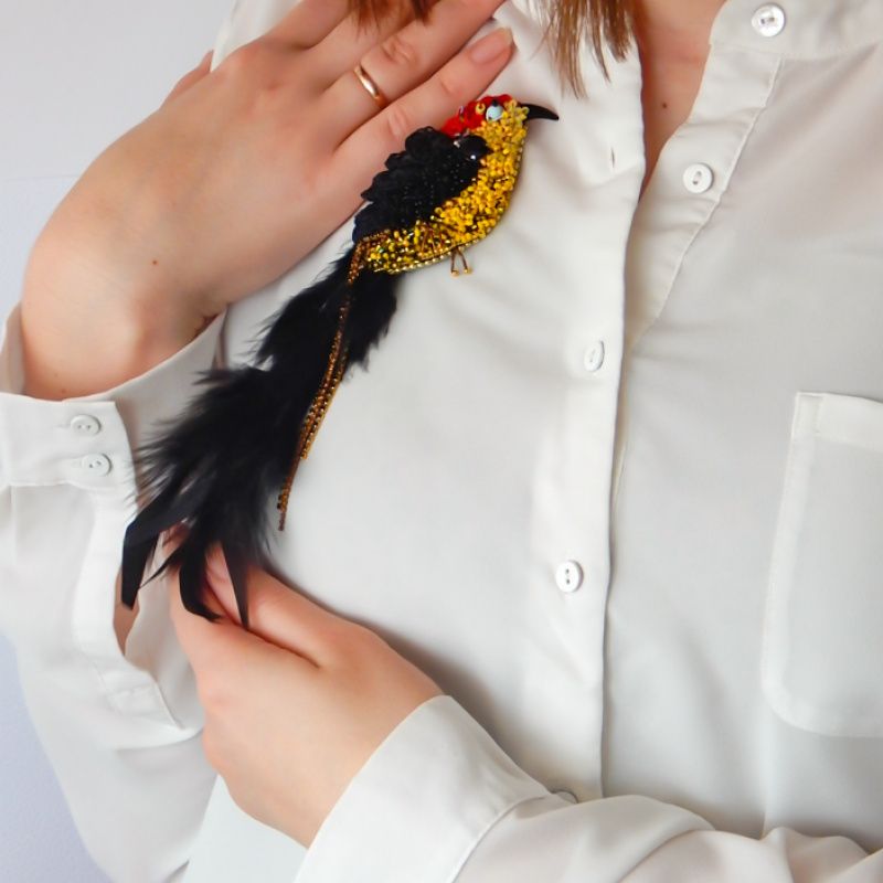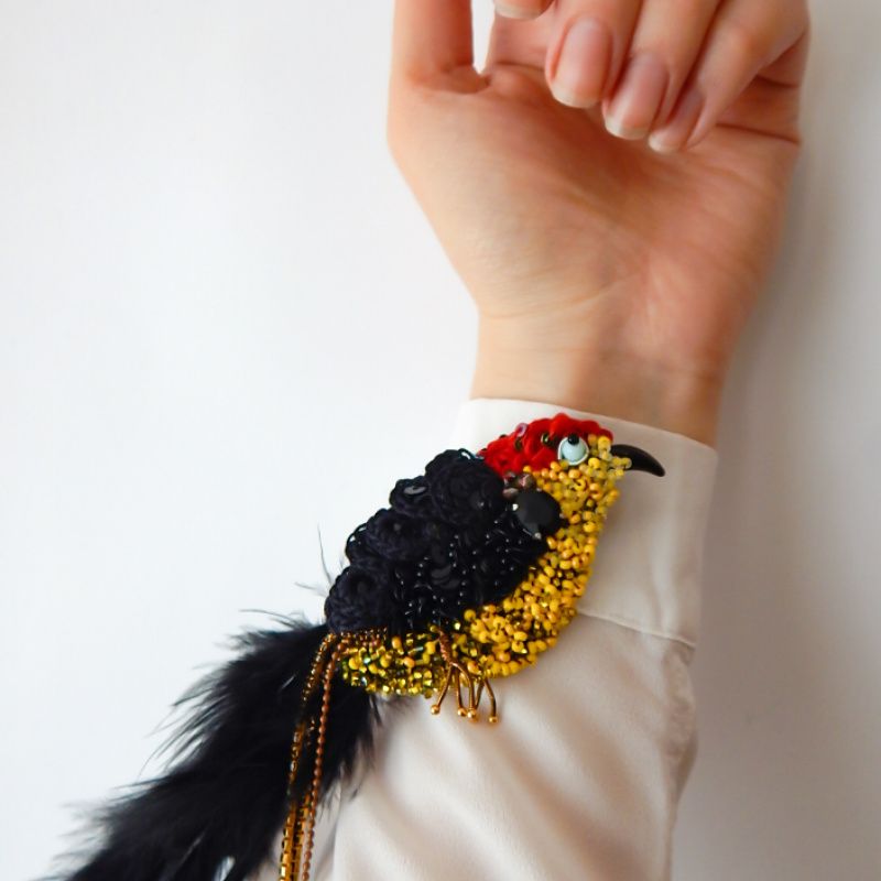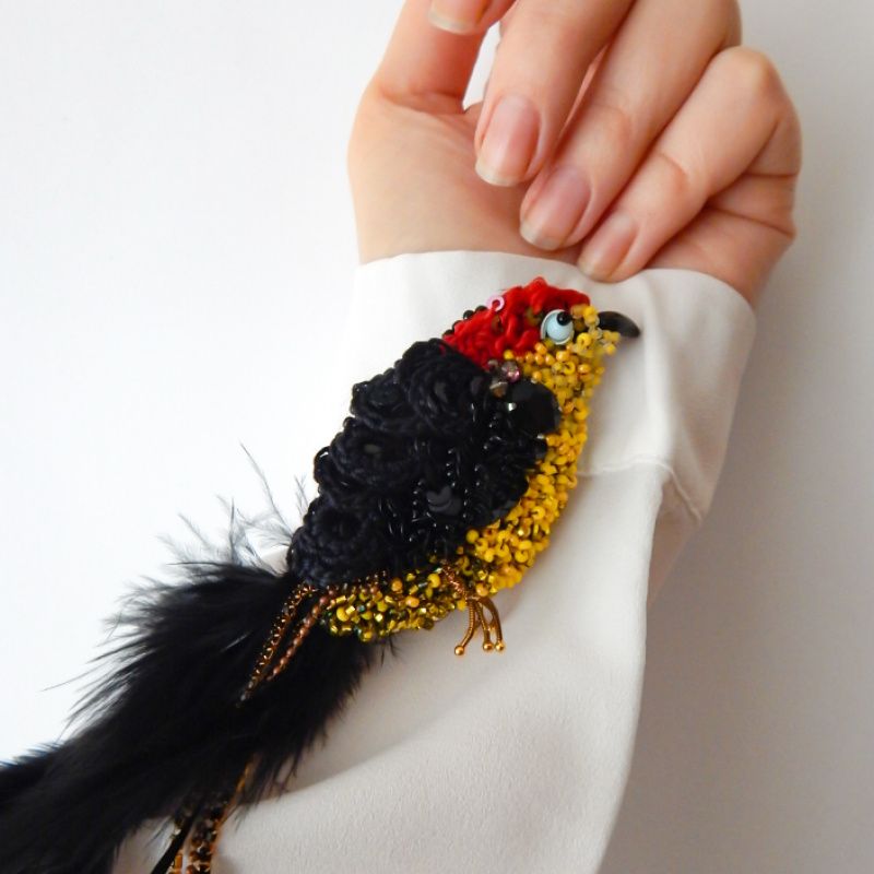 В этой работе использовала разные техники:работа с перьями, декор ниткой в прикреп, стразовые цепочки и объемные элементы из ниток. Размер 20×4 см