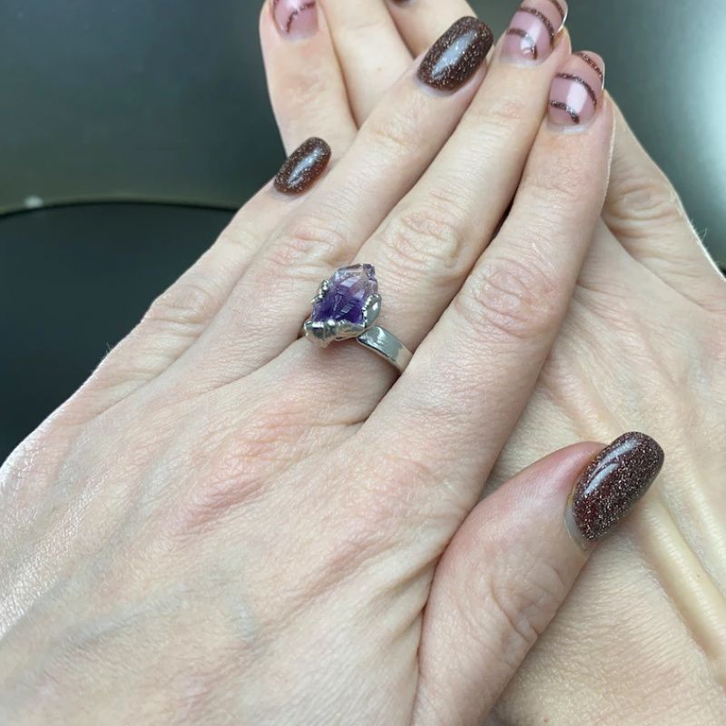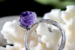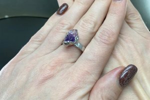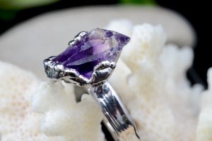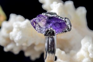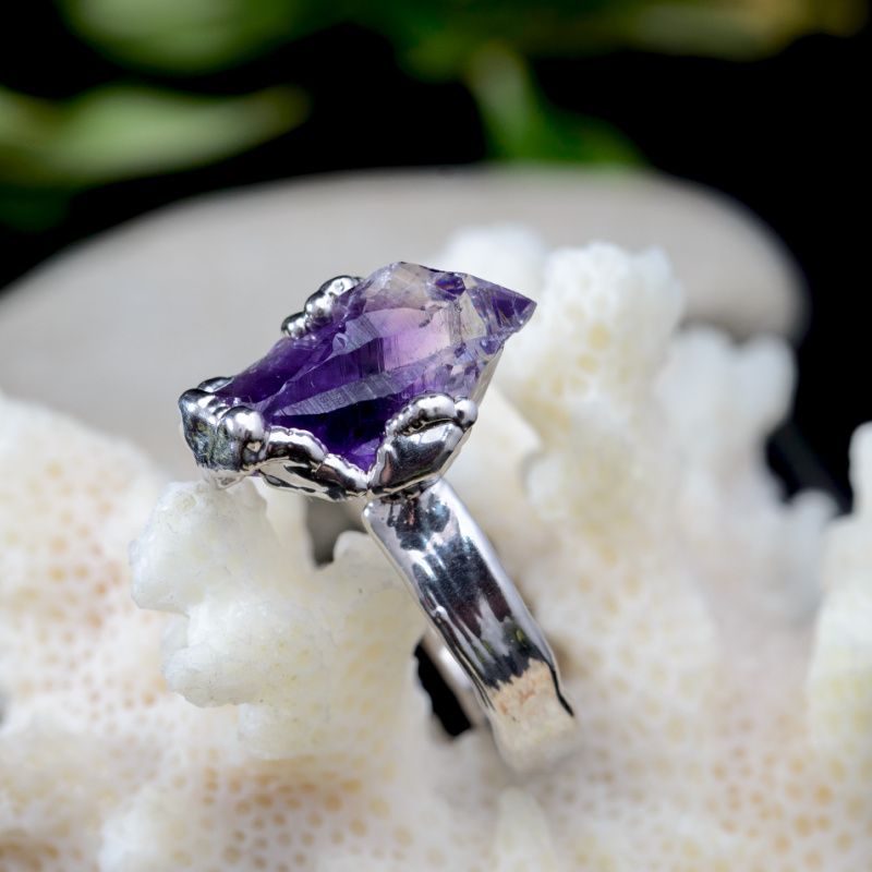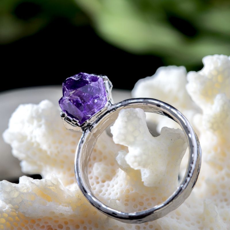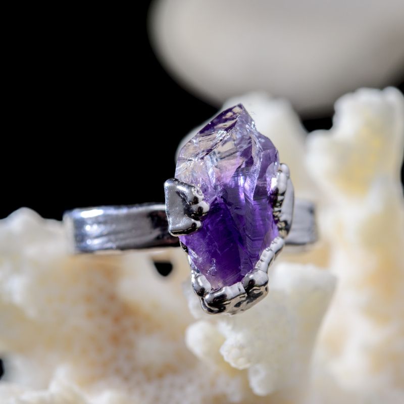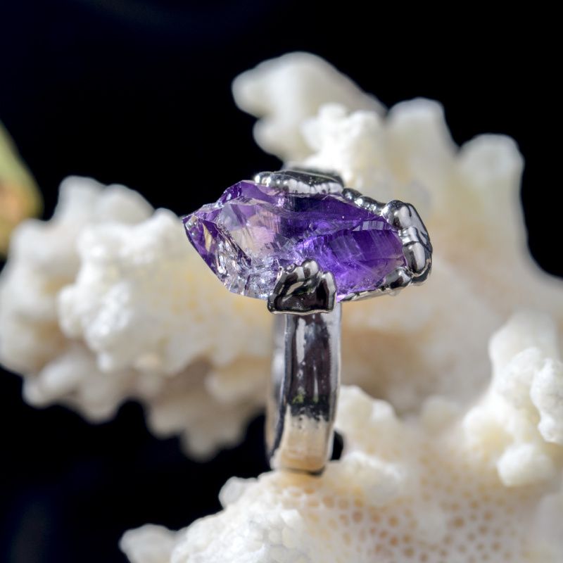 Природный необработанный кристалл аметиста. Серебряное серебро 999 пробы. Полное покрытие белым родием для защиты от потемнения. Необработанные кристаллы обладают естественными включениями, трещинками и шероховатостью.