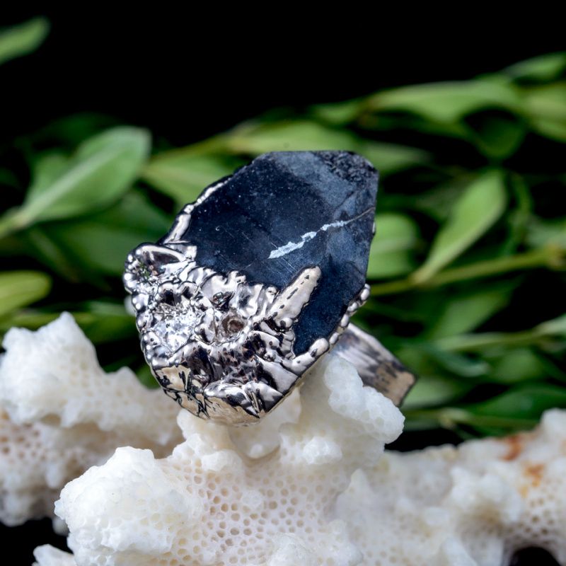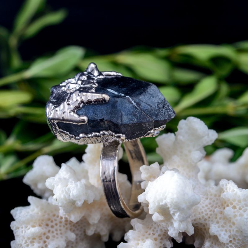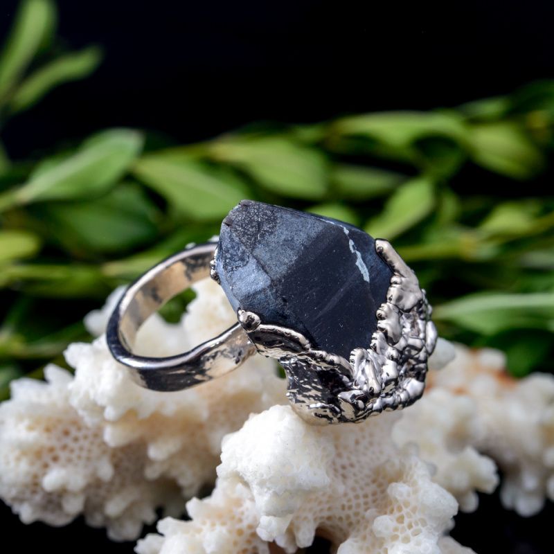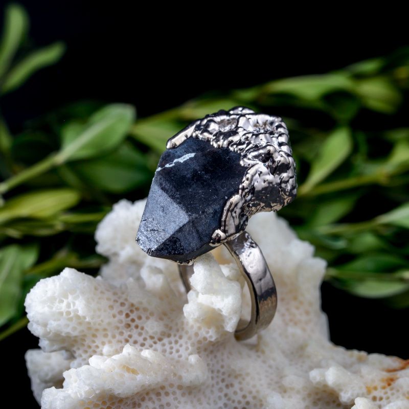 Кольцо с естественным необработанным кристаллом мориона. Серебряное серебро 999 пробы. Полное покрытие белым родием. Кристалл имеет естественные включения, трещинки и шероховатости.