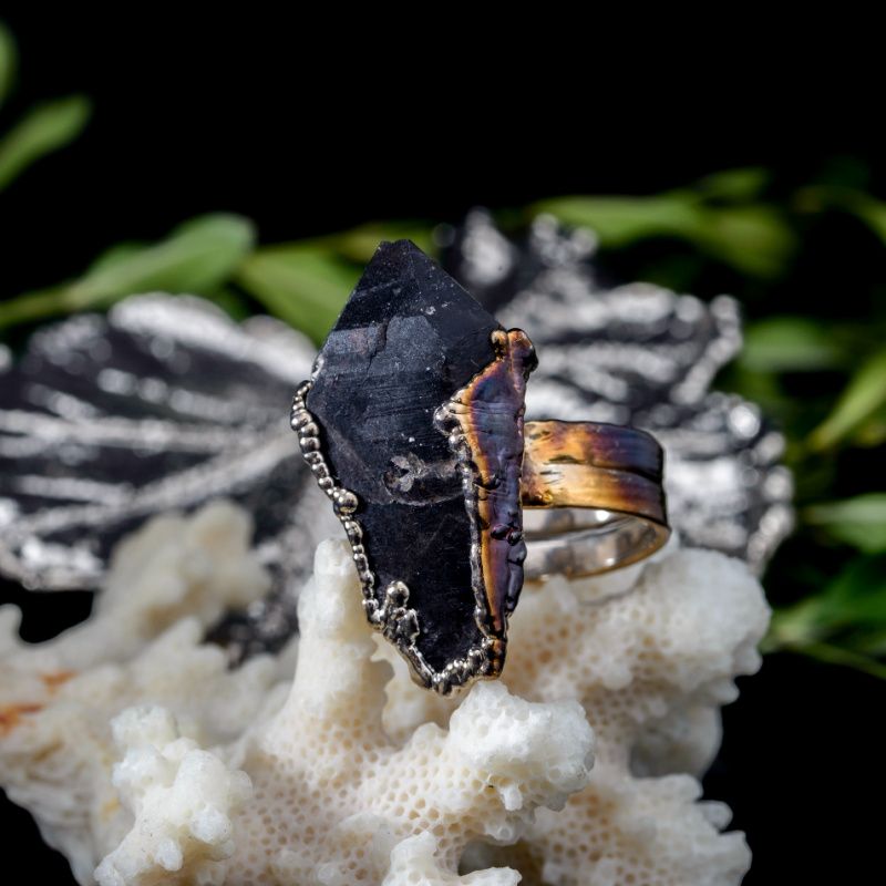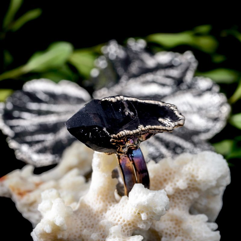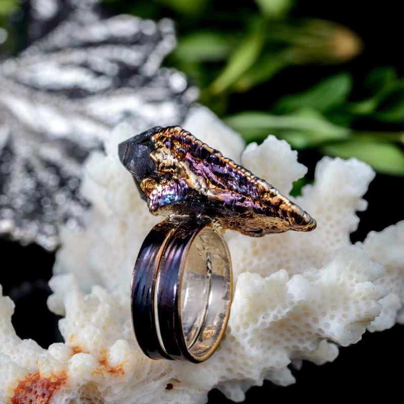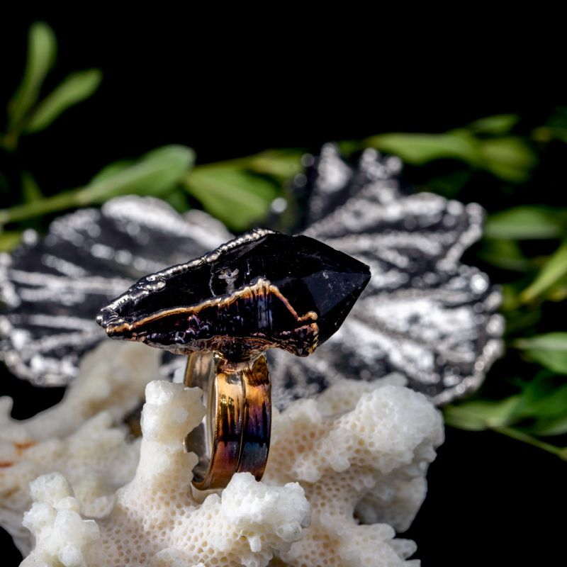 Кольцо с естественным необработанным кристаллом мориона. Серебряное серебро 999 пробы. Полное покрытие белым родием. Локальное нанесение золота 24 карата и черного родия. Кристалл имеет естественные включения, трещинки и шероховатости.