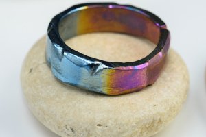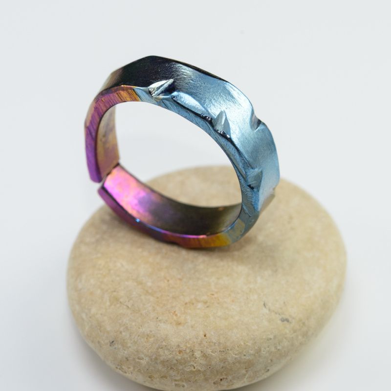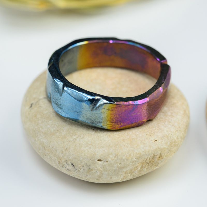 Титан – редкий металл с гипоаллергенными свойствами. Его не встретишь в стандартной ювелирке, с ним работают небольшие частные мастерские. Он редок и работа с ним очень сложна. Каждое украшение делается совершенно вручную (не бывает литейки и штамповки), поэтому каждое кольцо уникально по-своему. Он не содержит аллергенов и никеля, является биосовместимым металлом. Из него делают хирургические импланты. Еще очень легкий и очень крепкий. При действии электричества различного напряжения металл приобретает яркие цвета или их сочетание. Это кольцо мы анодировали в сочетание ярких цветов. Цвет очень устойчив, ему не повреждены моющие средства, не кремы, не другие химические вещества, которые встречаются в быту. Татан славится своей твердостью, а изделия из него – крепостью. Кольцо не цельное (имеет разъем), но изменять размер не получится, потому что металл очень жесткий, не сгибается и не разгибается, как серебро или золото.