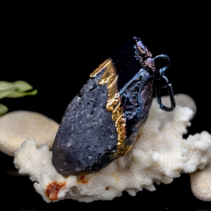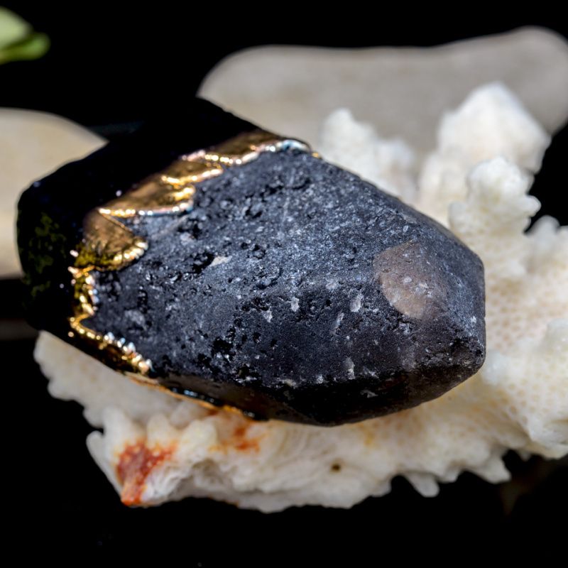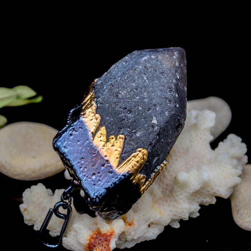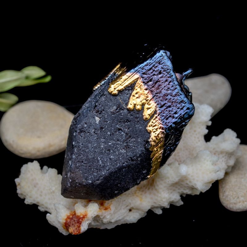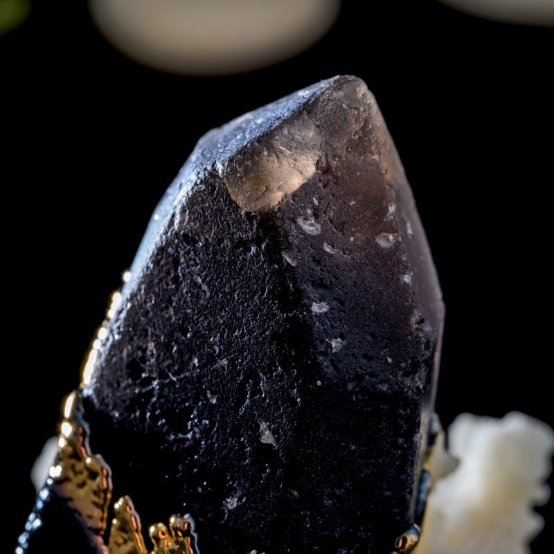 Природній необроблений кристалл дуже темного димчатого кварцу покритий міддю, нікелем та дорогоцінним металлом - рутенієм. Локальне нанесення золота.