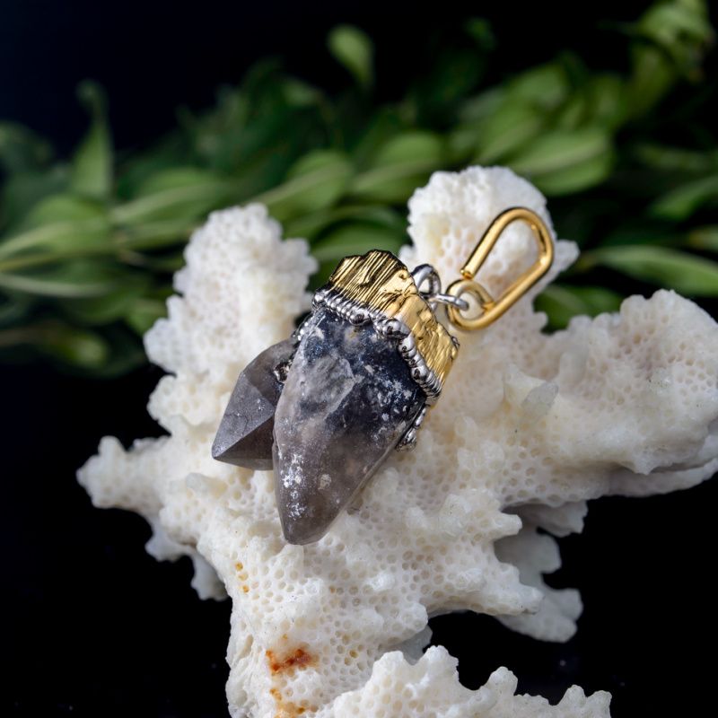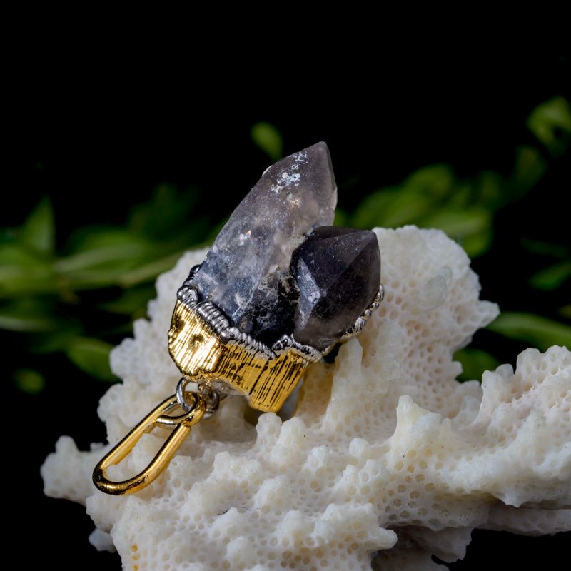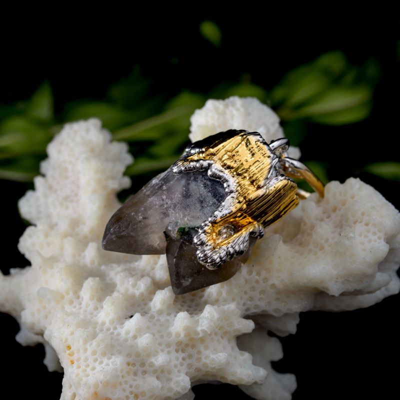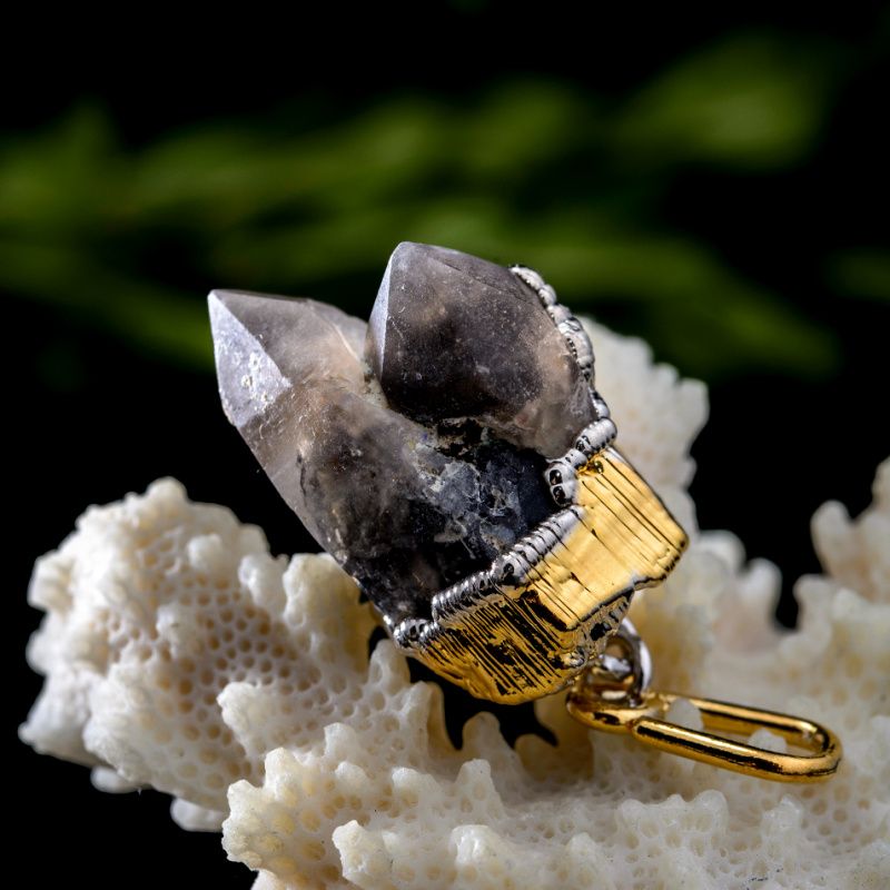 Они словно сплелись в объятиях. Камни как люди. Они растут и на них влияет их окружение. Только длится это не год и не два, а сотни и тысячи лет. Этот кристалл рожден морионом с темной непрозрачной душой, но затем обстоятельства изменились и верхний слой стал расти прозрачным дымчатым кварцем. Кристалл можно долго рассматривать: его включение, линии роста, линии перехода из одного минерала в другой. Имеет естественные включения. Медь, никель, белый родитель. Локальное нанесение золота.