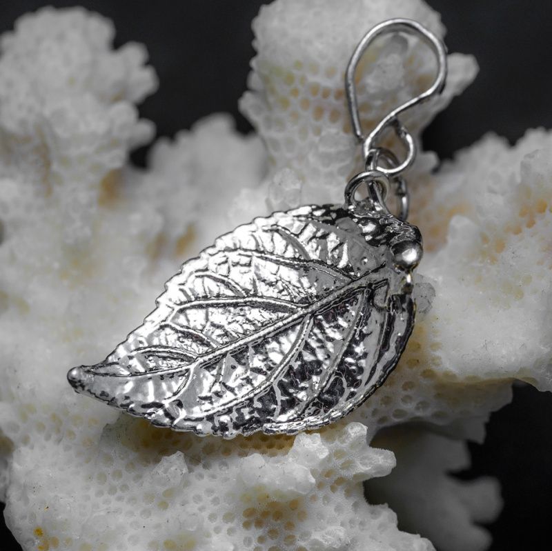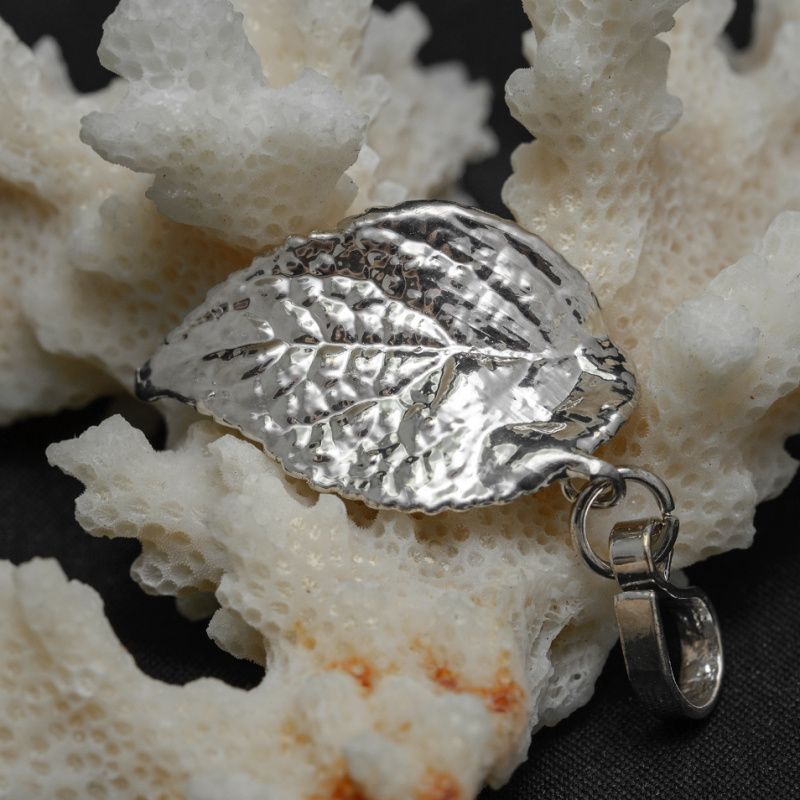 Кулон в стиле минимализм: маленький лист покрыт медью, серебром и белым родием. Может стать подарком для вегетерианца или просто любителя леса, природы и экостиля.
