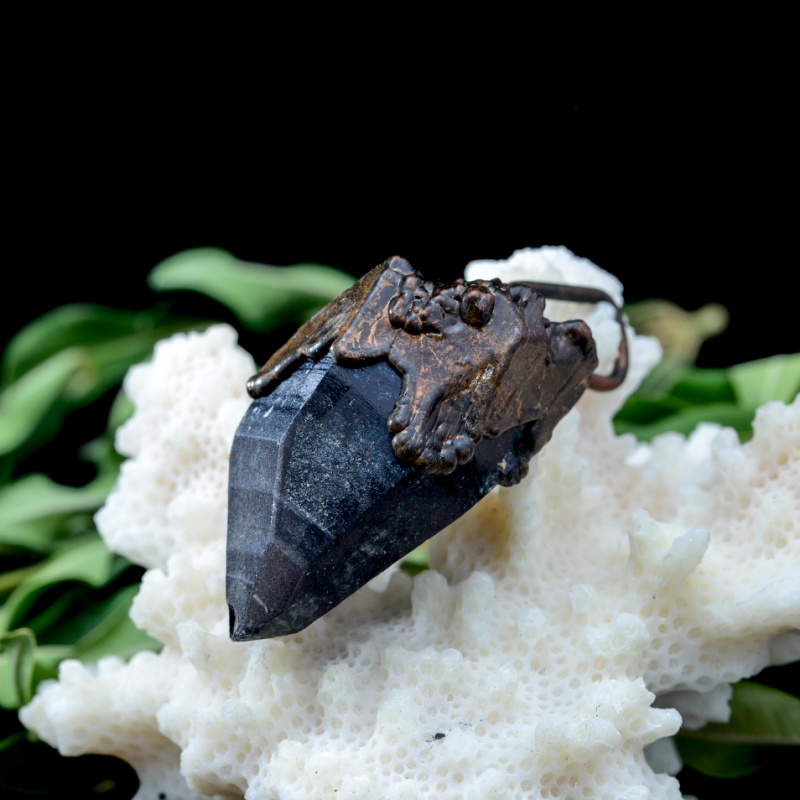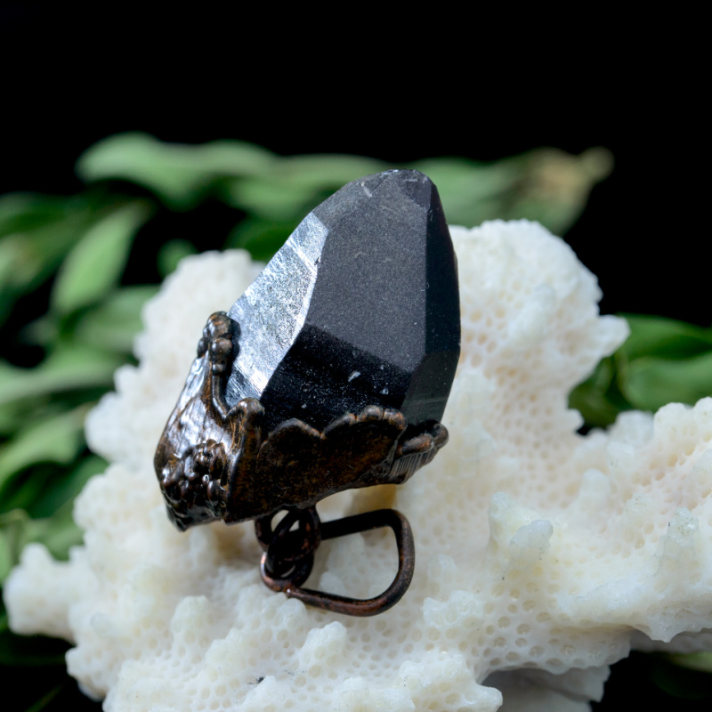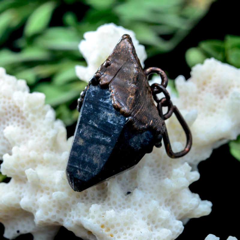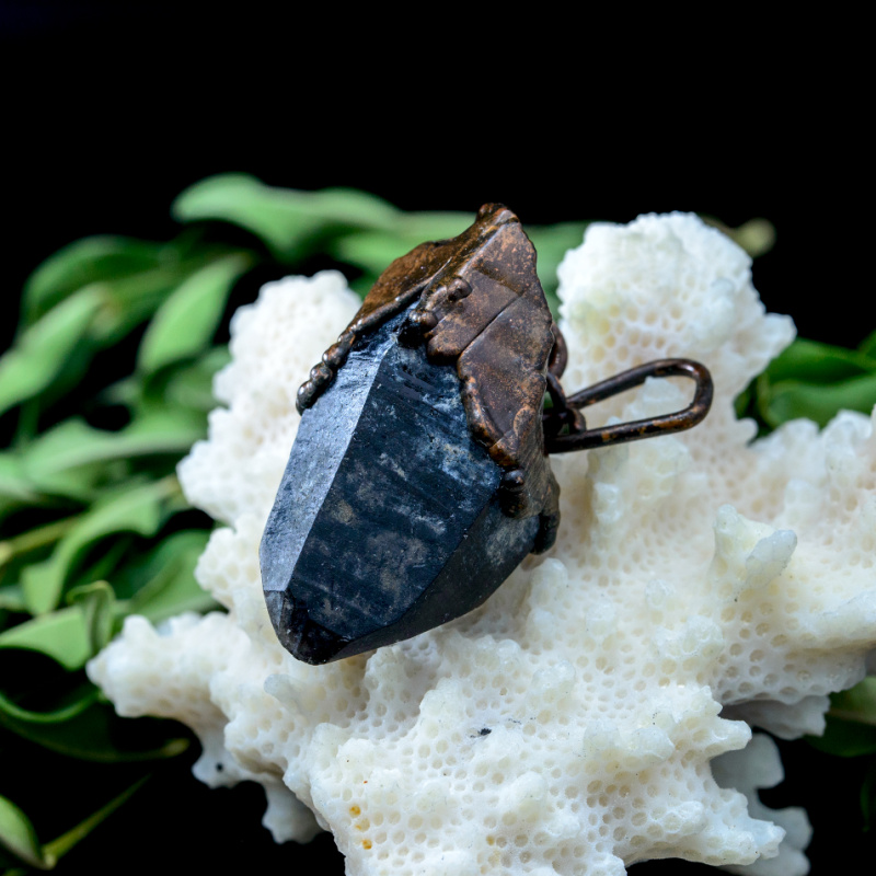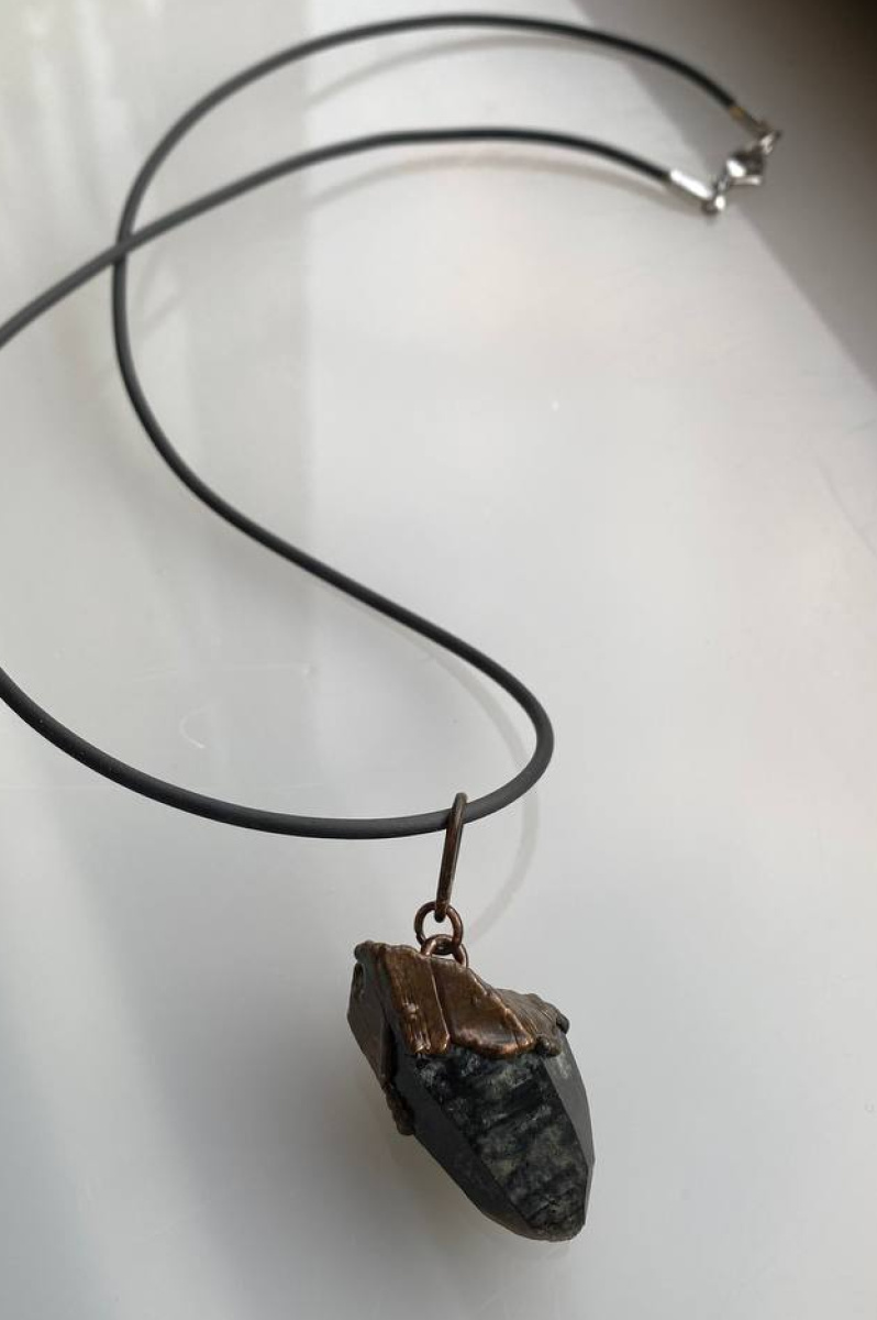 Природный необработанный кристалл мориона покрыт медью. Темная радужная патина. Лак. Кристалл не подвергался обработке. Необработанные камни могут иметь естественные включения, трещины и шероховатости. Шнурок любой длины в подарок.