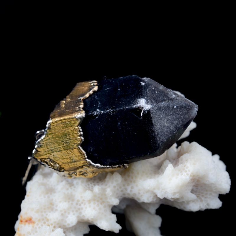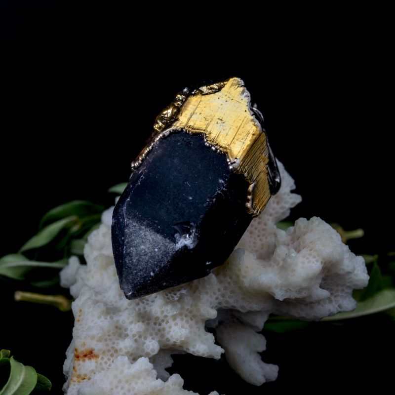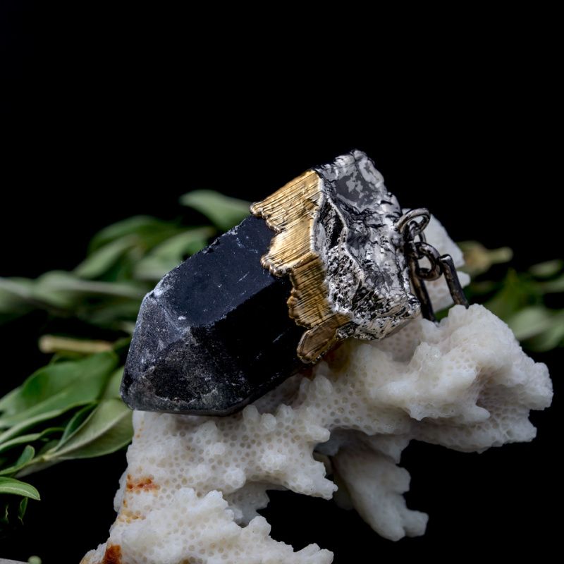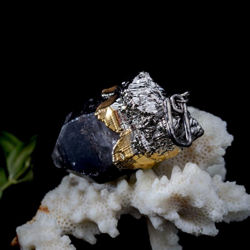 Природный необработанный кристалл мориона с природными включениями покрыт медью, никелем и металлом платиновой группы – белым родием. Локальное нанесение золота. . Камень имеет множество естественных включений. Необработанные кристаллы имеют естественные включения, трещины, сколы, шероховатости. Каждый камень уникален и неповторим. Не бывает в природе двух совершенно одинаковых природных кристаллов. Природа делает копии. Морион считается камнем магов и ведьм.