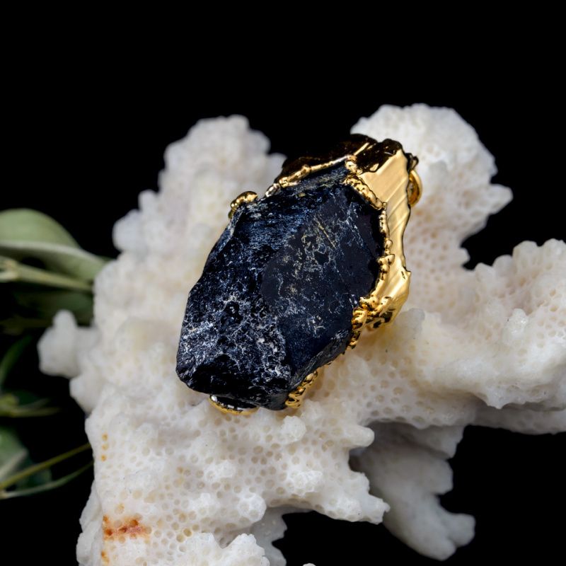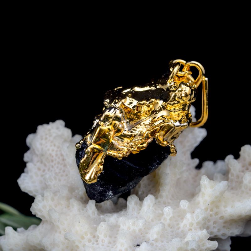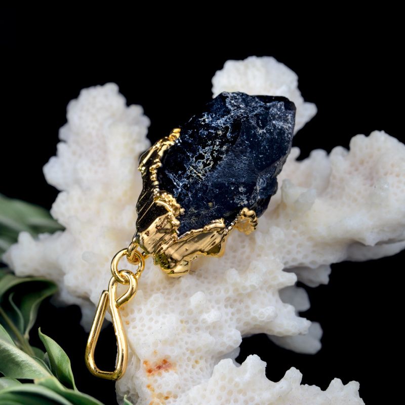 Природный необработанный кристалл мориона покрыт медью, никелем и белым родием. Локальное покрытие золотом 24 карата. Необработанные кристаллы обладают естественными включениями, трещинками и шершавостью.