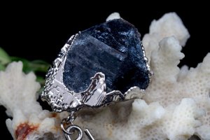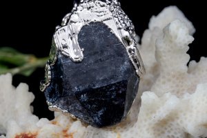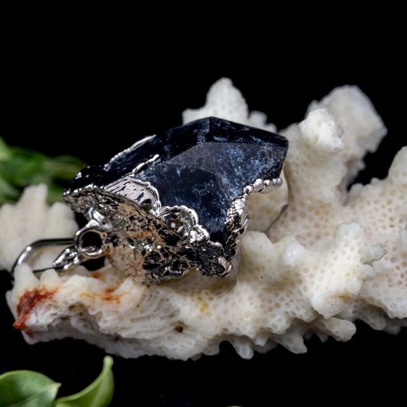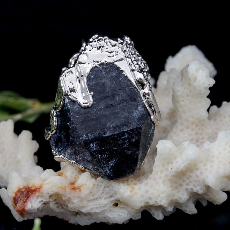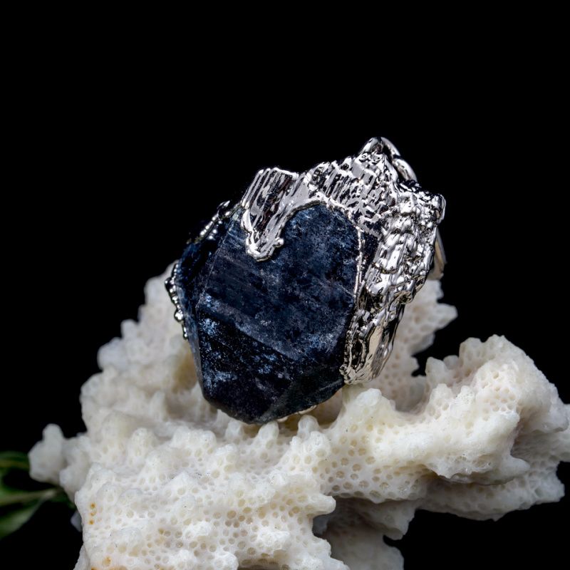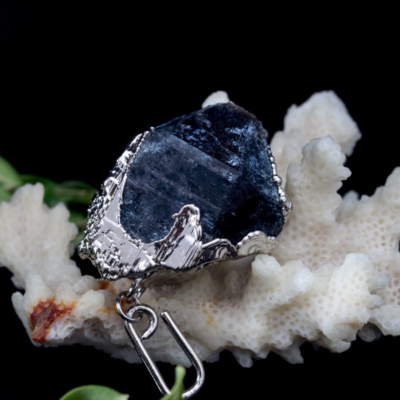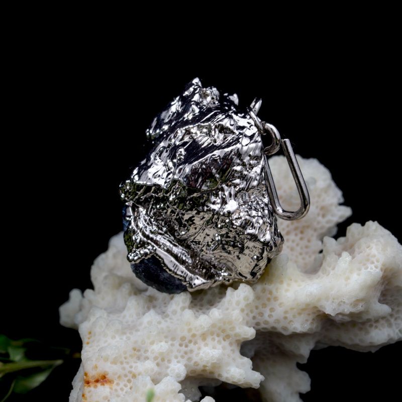 Природный необработанный кристалл покрыт медью, никелем и драгоценным металлом – белым родием. Камень имеет естественные включения, трещинки и шероховатости.