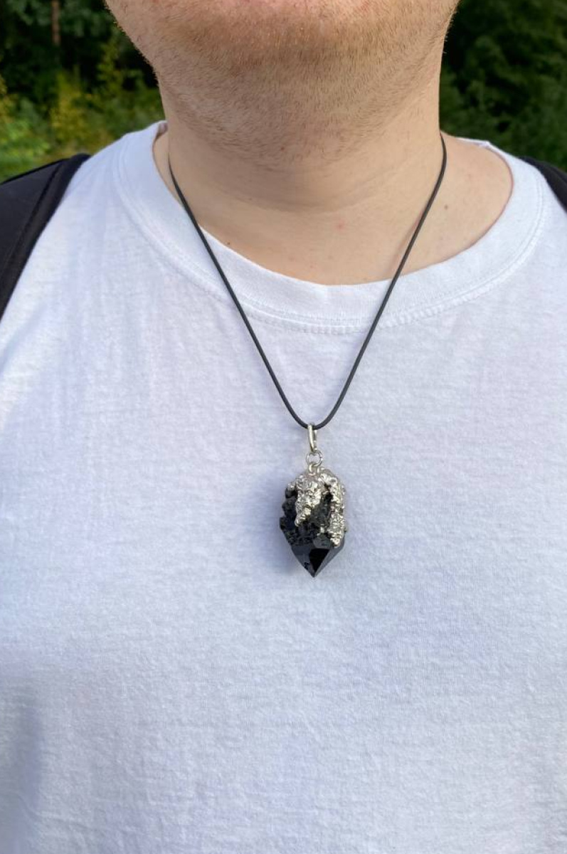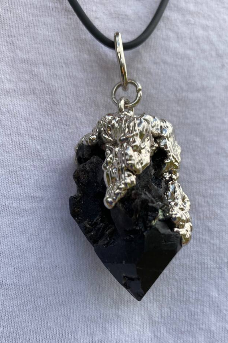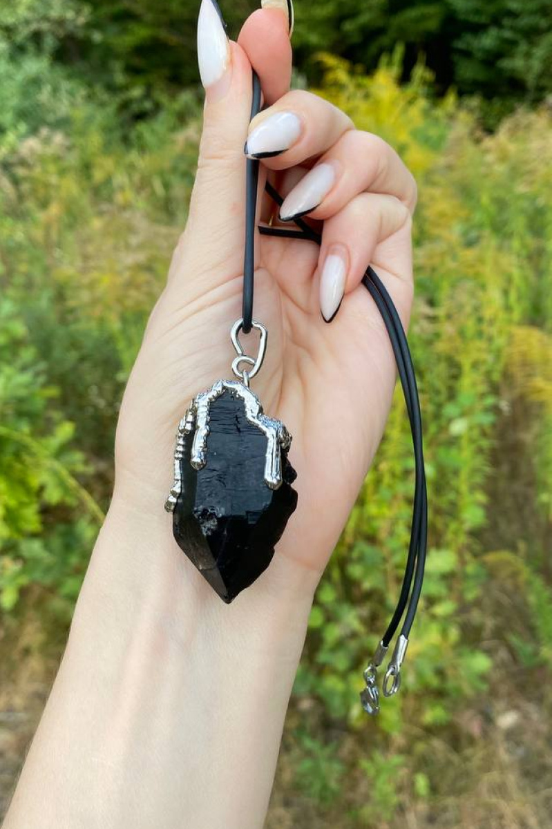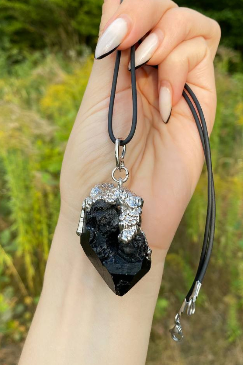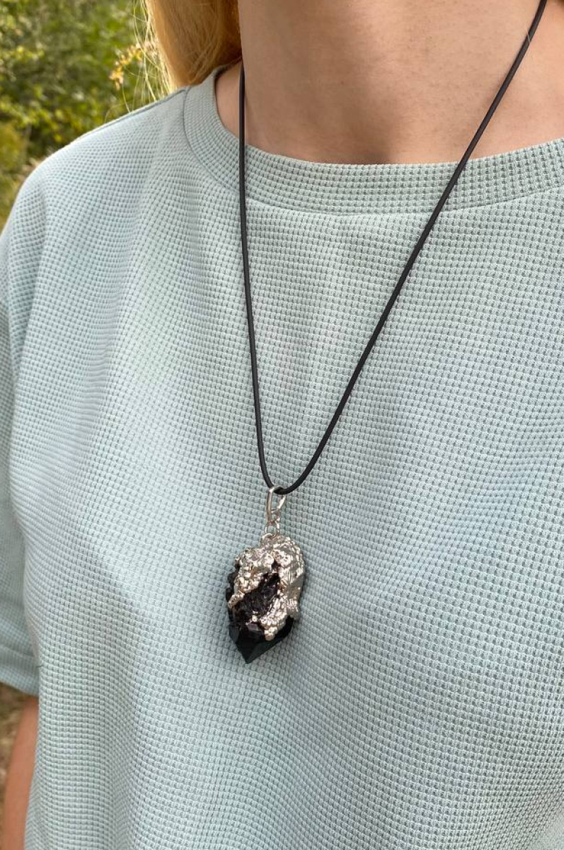 Природный необработанный кристалл мориона покрыт медью, никелем и драгоценным металлом – белым родием. Камень имеет естественные включения (целые пещеры), трещинки и шероховатости.