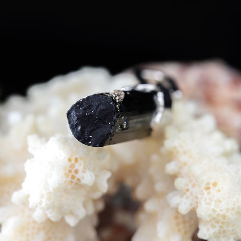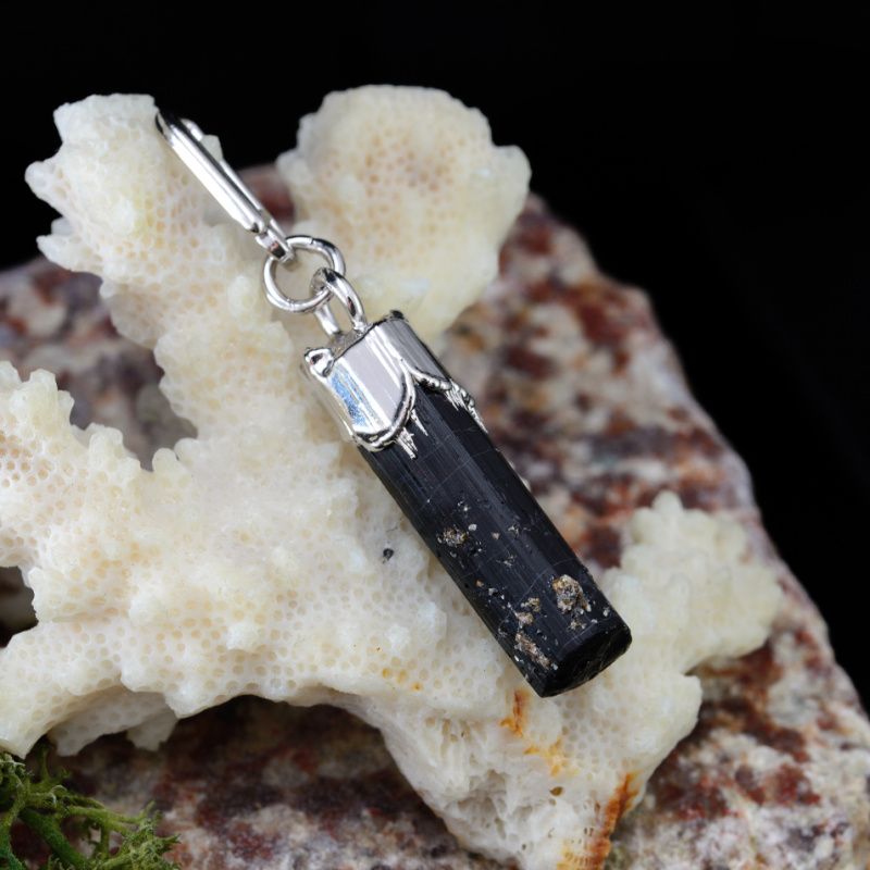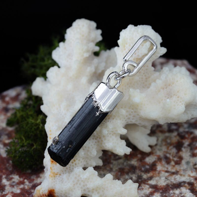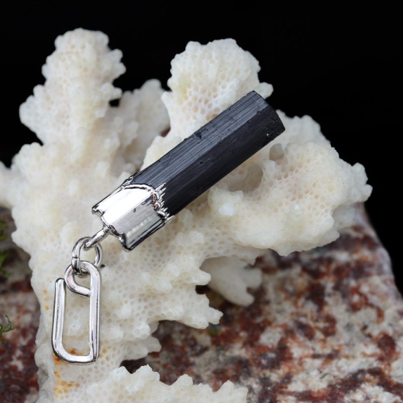Природный необроблений кристалл чорного турмаліну (шерл) покритий міддю, нікелем та дорогоцінним металлом - білим родієм.