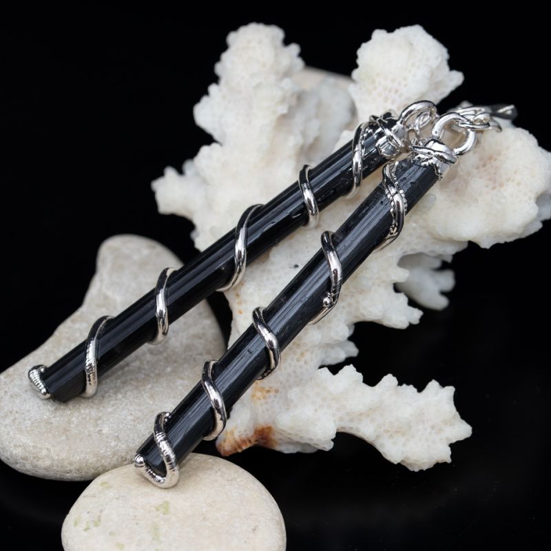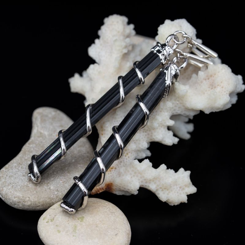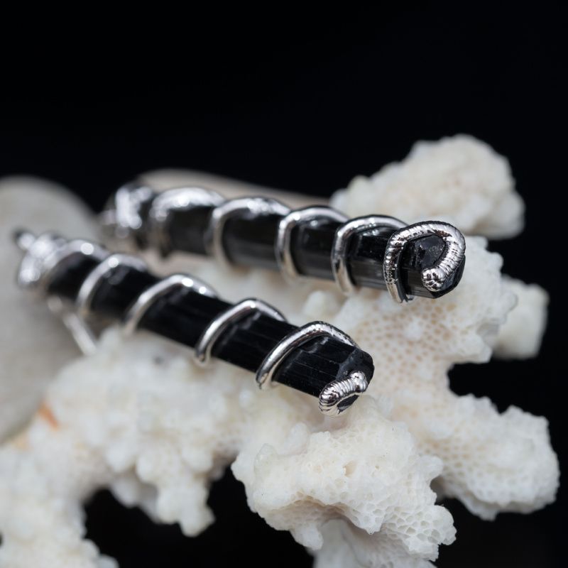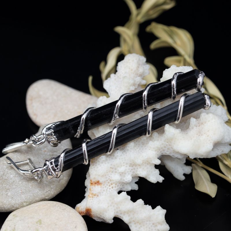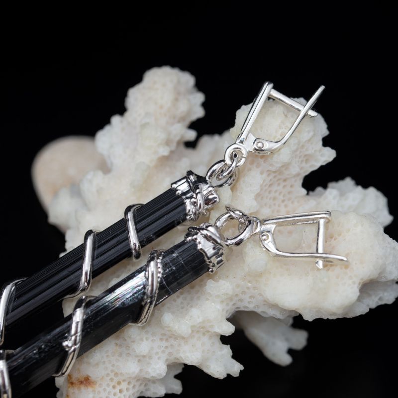 Очень длинные серьги из природных необработанных кристаллов черного турмалина.