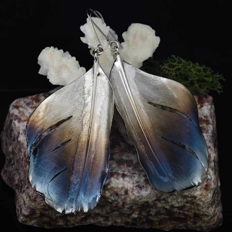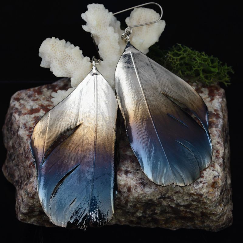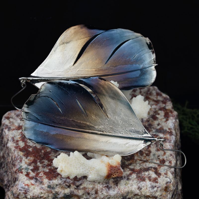Настоящие перья птиц семейства Врановых покрыты медью, никелем и металлом платиновой группы – рутений. Длинные, легкие и с прекрасным хмурым переливом. Внутри хранятся настоящие перья. Крючки из титана.