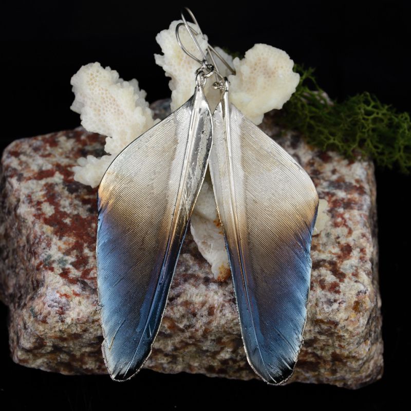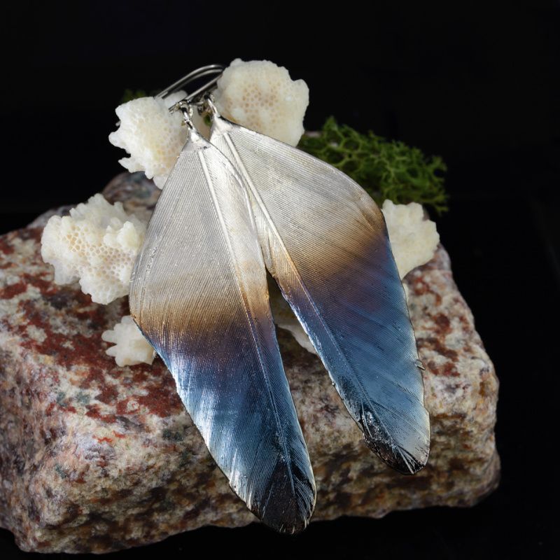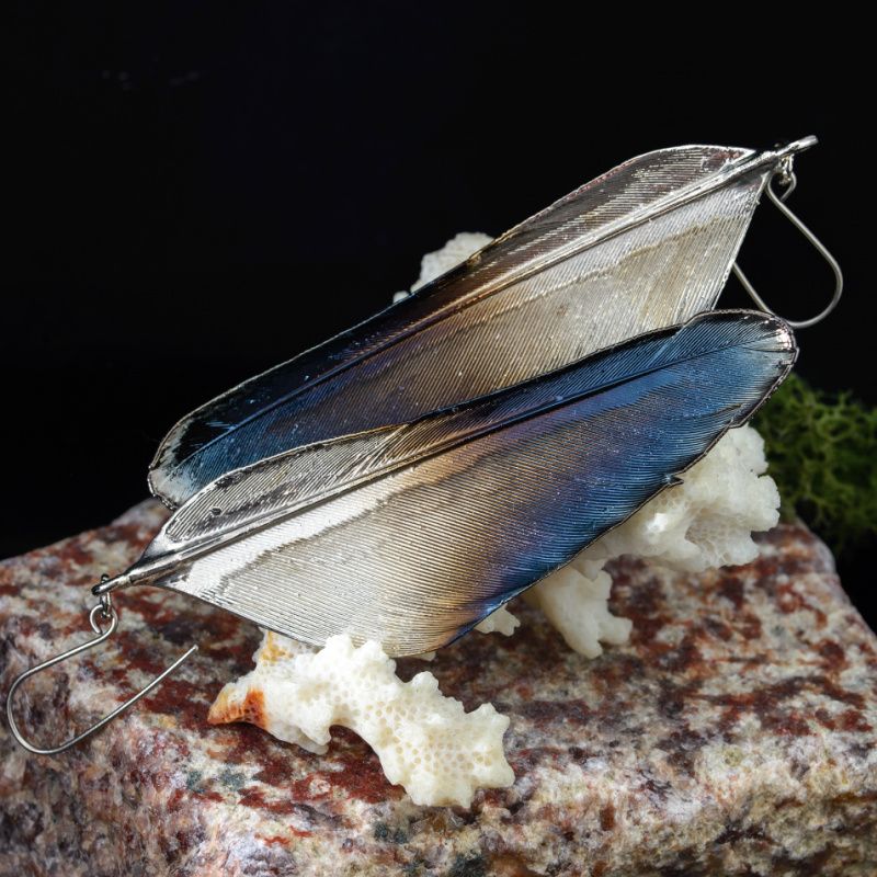 Настоящие перья птиц семейства Врановых покрыты медью, никелем и металлом платиновой группы – рутений. Длинные, легкие и с прекрасным хмурым переливом. Внутри хранятся настоящие перья. Крючки из титана.