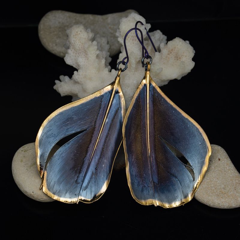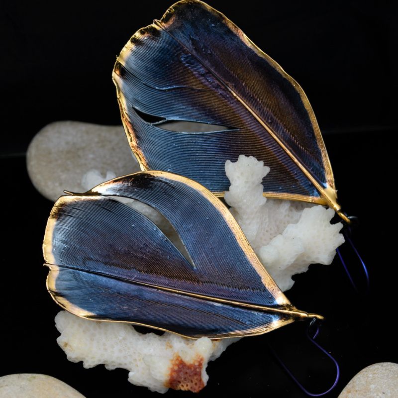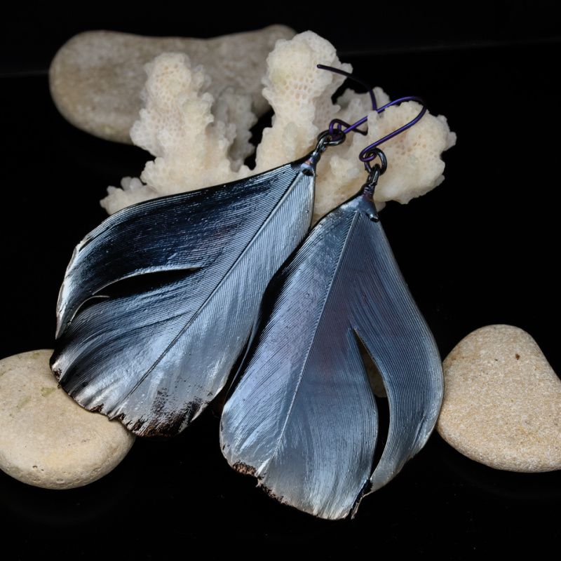Настоящие перья птиц семейства врановых (грачей) покрыты медью, никелем и металлом платиновой группы – рутений. Локальное нанесение золота. Длинные, легкие и с прекрасным хмурым переливом. Внутри хранятся настоящие перья. Крючки из титана