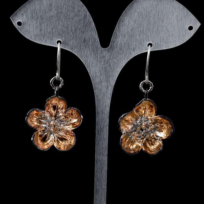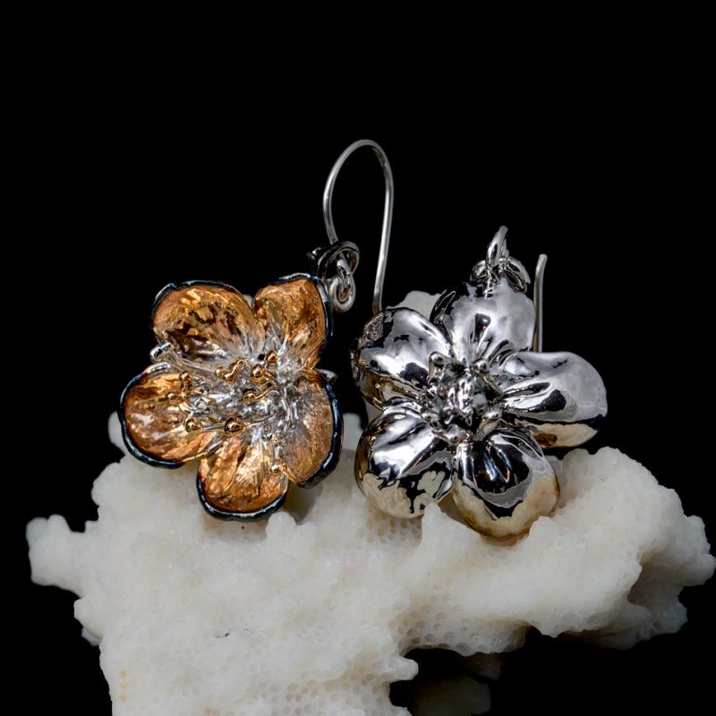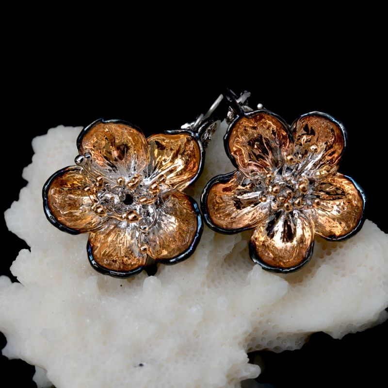 Настоящие цветы вишни покрыты металлом. Свежий цветок покрывается медью, никелем и драгоценным металлом – белым родием. Локальное нанесение золота и черного родия. Крючки из серебра. Чтобы заглянуть за кулис нашей мастерской и увидеть процесс покрытия цветов металлом подписывайтесь на наш профиль в инстаграмм.