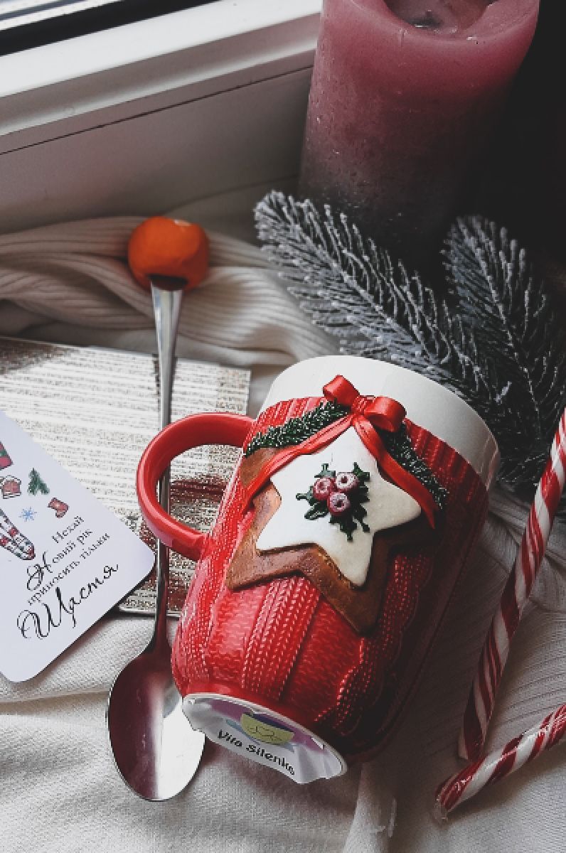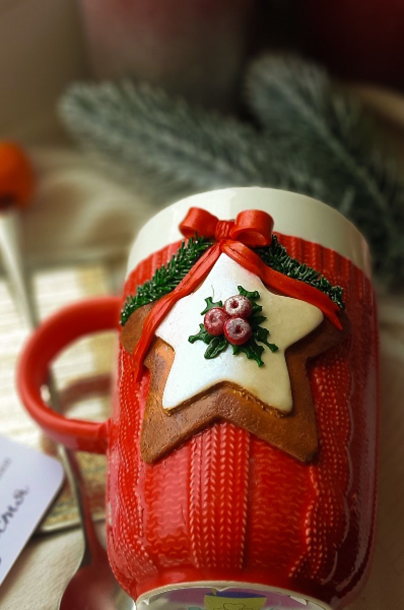 Рождественская кружка "вязка", красного цвета, украшенная композицией в виде медового пряника. Материал полимерная глина, ручная работа. Декор надежно закреплен на эпоксидном клей poxy pol. Кружечку можно использовать каждый день, ручную мойку. В кружочки в комплект входит ложка на верхушке декорированная мандаринкой.