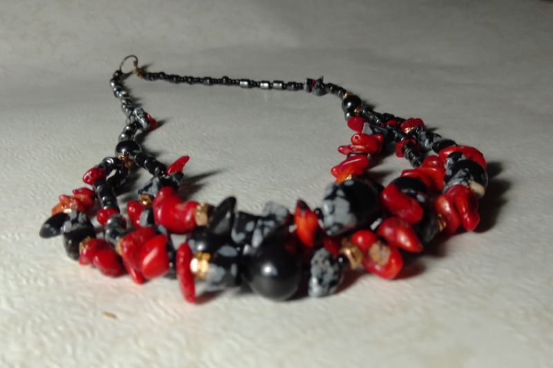 Снежный обсидиан рождается в недрах вулкана и его сила - от лавы, которая прокладывает свой путь там, где пожелает. Коралл - утверждение права на своё решение, и гематит - защита от негатива. Медь в бусинах-разделителях - для решительности. Вот такое безобидное на вид украшение для тех, кто решил кардинально поменять свою жизнь.