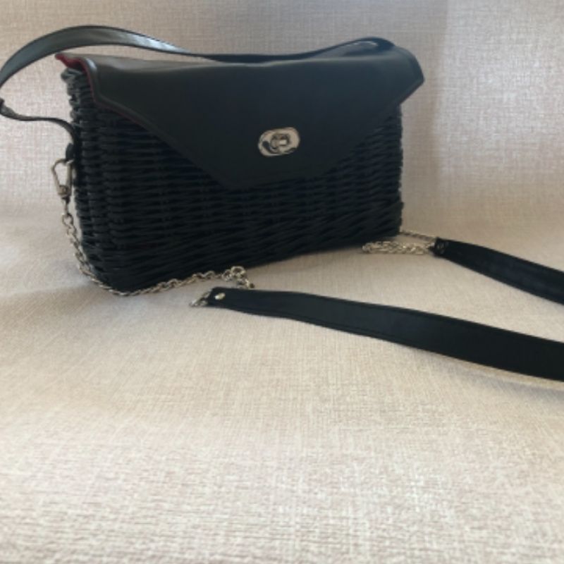 Оригинальное черная сумочка, очень аккуратная и красивая. Будет спутницей на прогулках и заставит прохожих оглядываться с восхищением! Внутри сумочки мягкая подкладка. Клапан на застежку, ручка и длинный ремень на цепочке с карабинами. Сумочка сплетена из бумажной лозы, обработанная защитными средствами высокого качества без запаха и вредных примесей. Очень прочная, влагостойкая. Она не размокнет под дождем, проверено! Эта красавица сейчас в наличии. В подарок - мешочек пыльник для хранения.