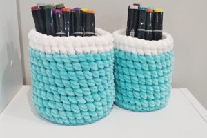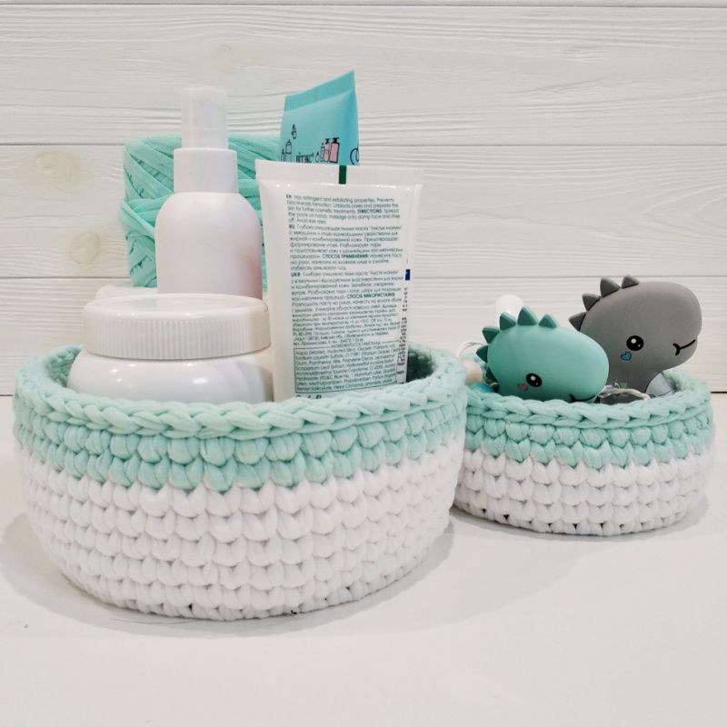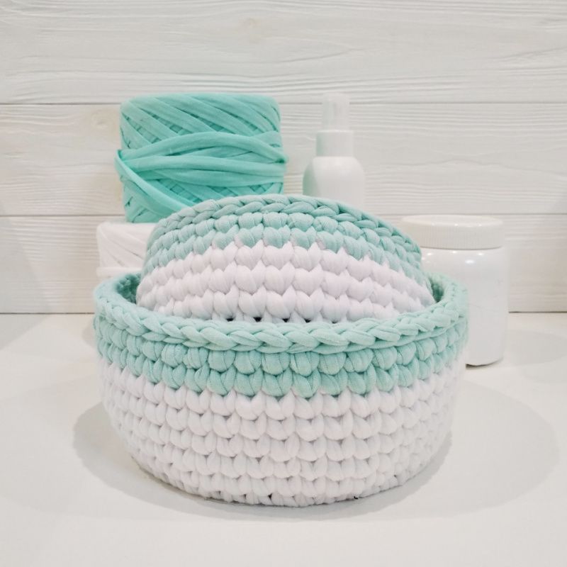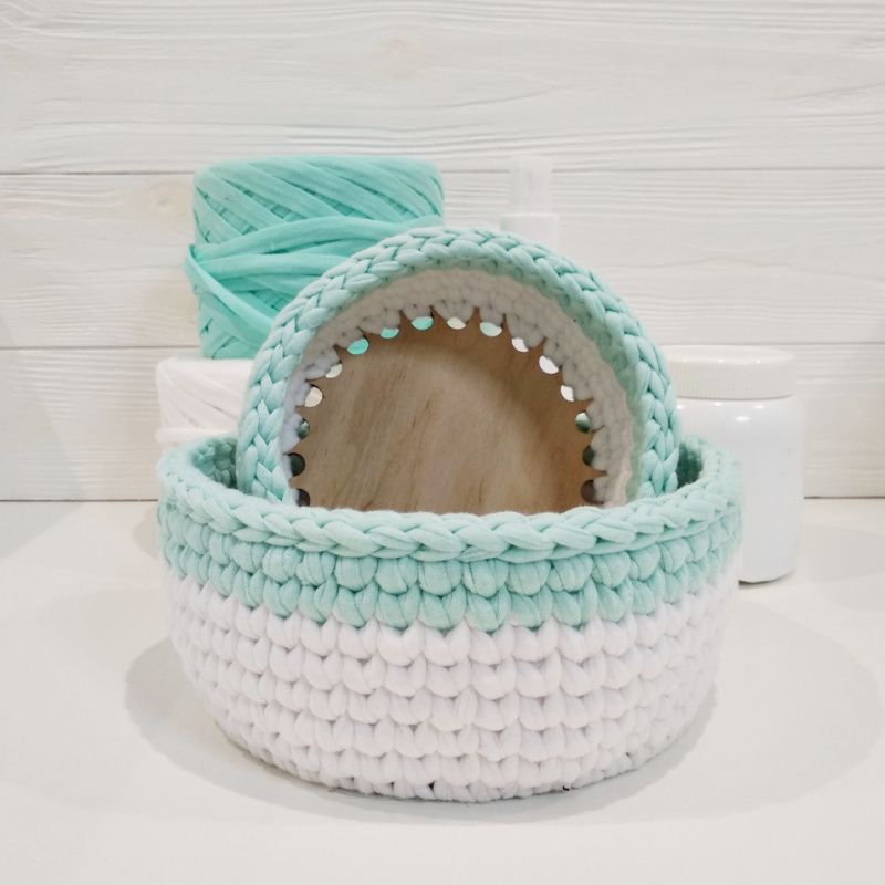 Вязаная корзина для интерьера ручной работы, связная с трикотажной пряжи. Идеально подходит для хранения косметики, домашних мелочей, украшений и личных вещей. Корзина впишется в любой интерьер вашего дома или квартиры. ---- Характеристики: 1️⃣ Цвет: белый, мятный 2️⃣ Материал: хлопок 100% 3️⃣ Материал донышка: дерево 4️⃣ Размеры: большая корзинка: донышко - 15 см, высота - 8 см, меньше корзину: донышко - 12 см, высота - 6 см. ---- ⛔ Внимание! Только ручная чистка! При длительном контакте с водой донышко может деформироваться.