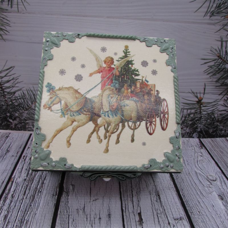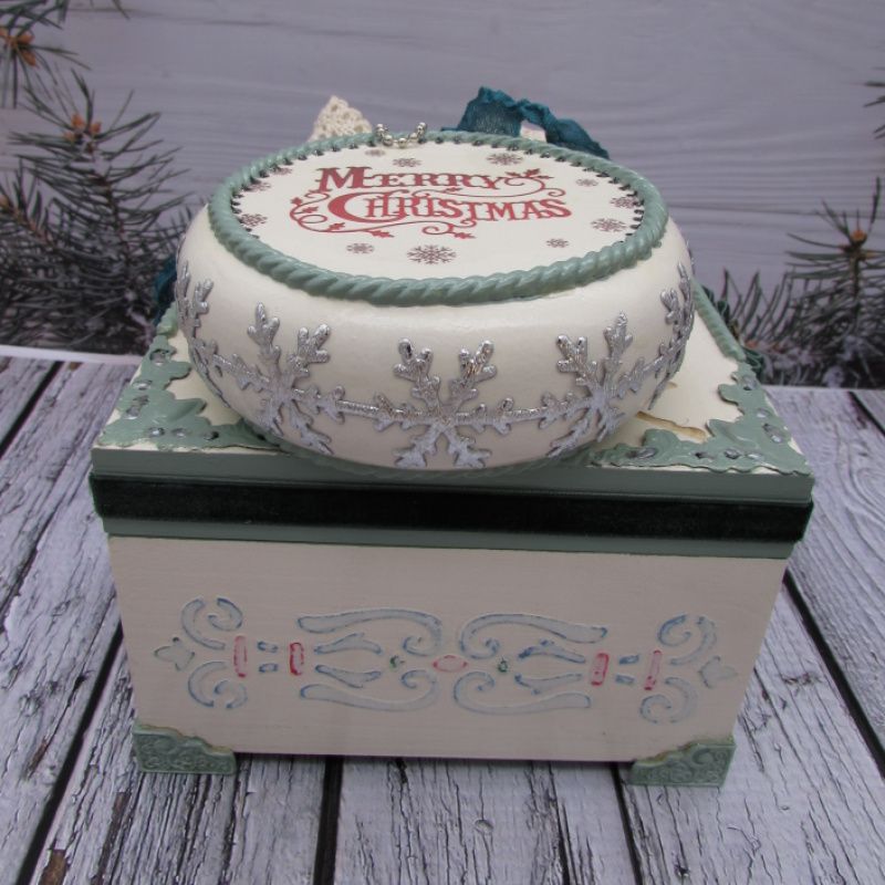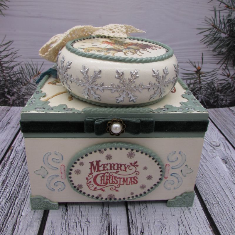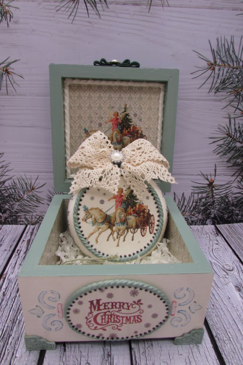 Шкатулка украшена шильдочкой с надписью , металлическими уголками,отливками ручной работы,имеет уголки-ножки. Медальон двухсторонний, украшен отливками ручной работы, по краю украшен декоративной лентой -снежинки . С одной стороны на медальоне вживлена картинка, с другой стороны надпись . Медальон украшен пышным бантом из натурально кружева, ленточкой шебби-шик .