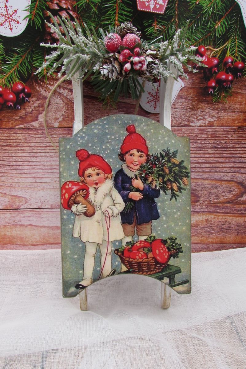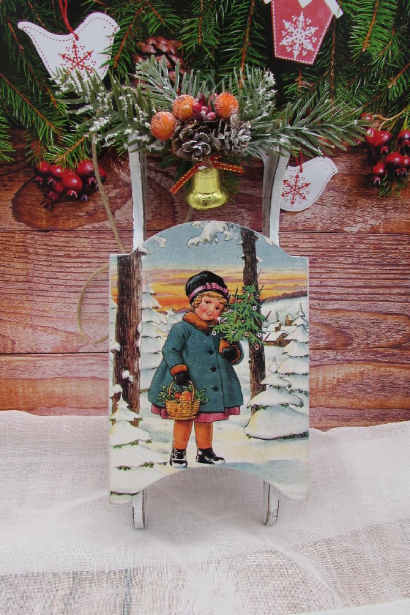Саночки украшены декором из еловых веточек,шишек,ягод.