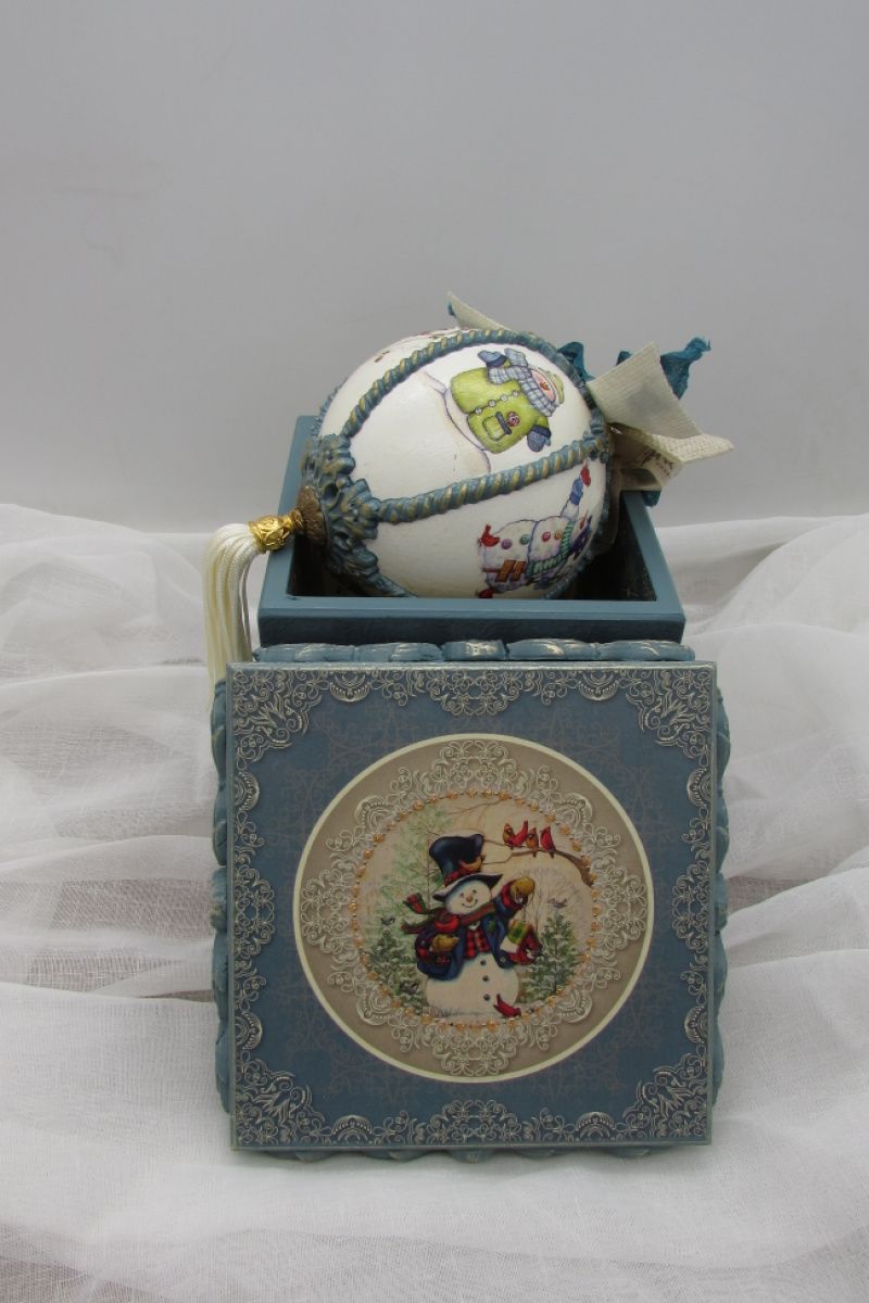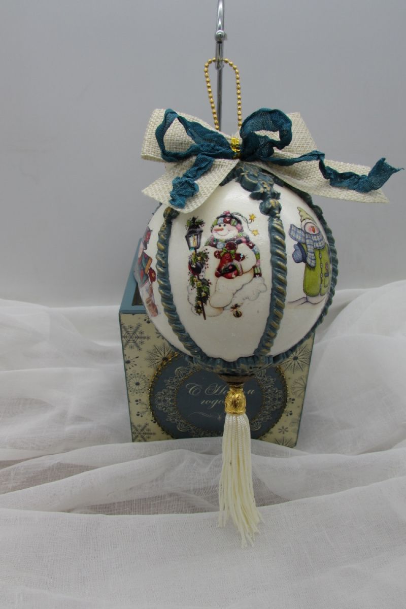 Шарик декорирован в техниках: вживление картинки, отливки ручной работы, покрыт лаком с глиттером,украшен бантиками с двух сторон и длиной кисточкой.