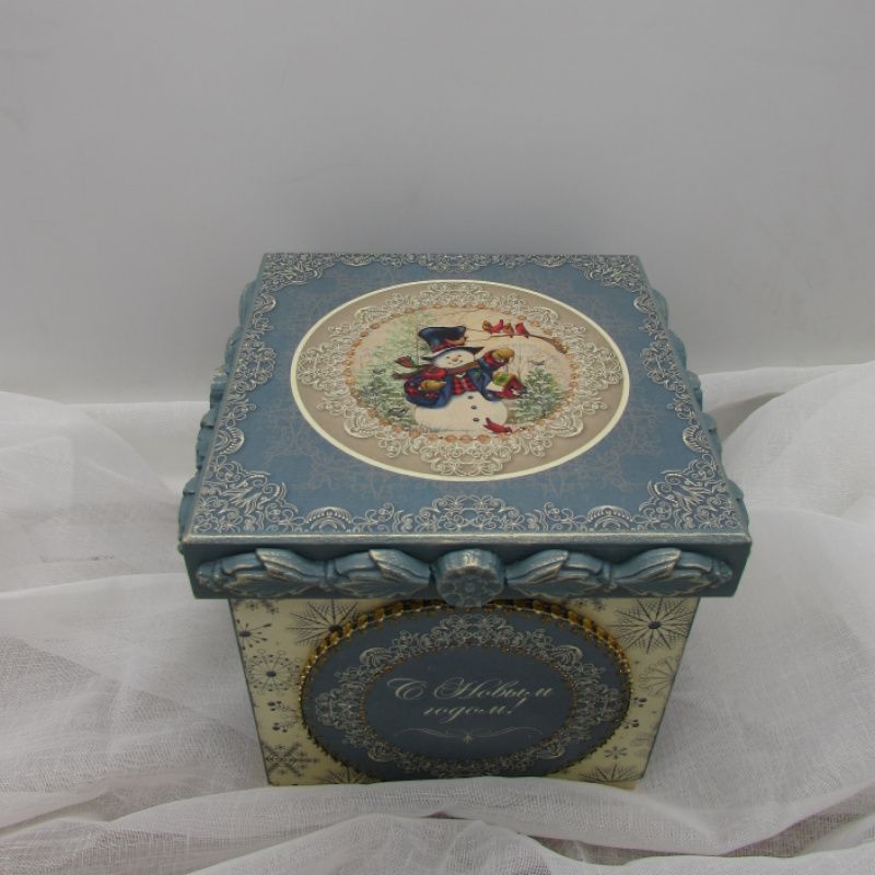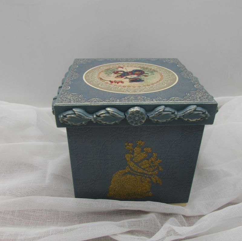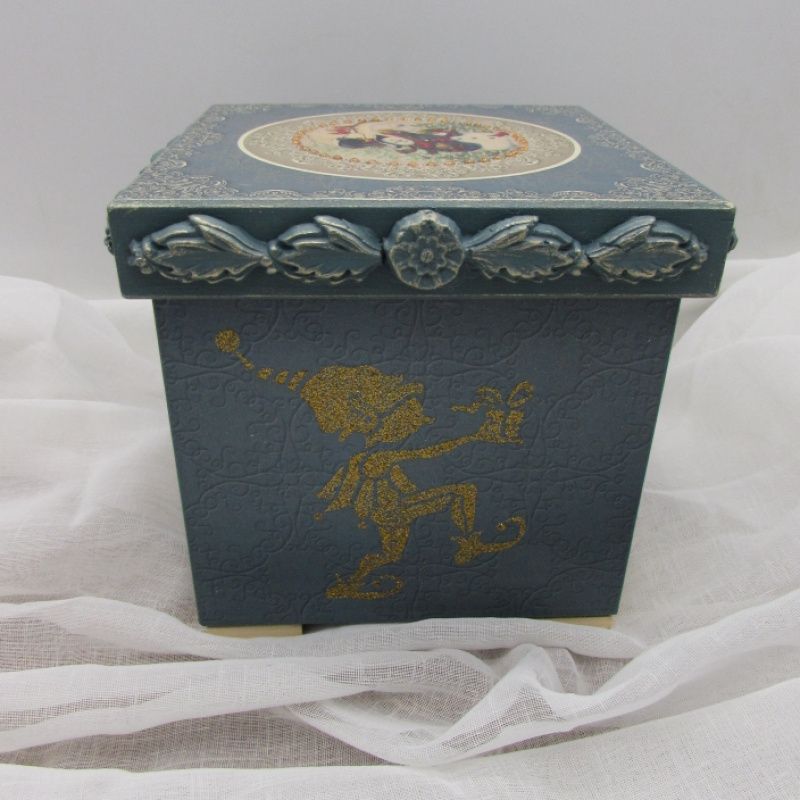 Крышка короба декорирована отливками ручной работы.Сам короб декорирован и с внутренней и с наружной стороны, в техниках:декупаж,вживление картинки ,трафаретная роспись,контурная роспись.