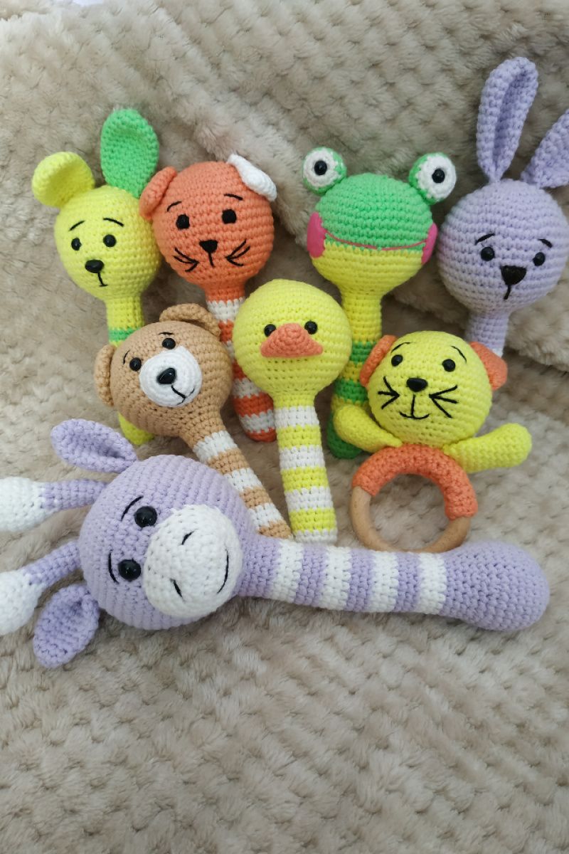 Веселые погремушки в виде зверушек обязательно порадуют малыша. Погремушка приятно звенит. Игрушка выполнена из хлопковой пряжи, мелкие детали на безопасном креплении.
