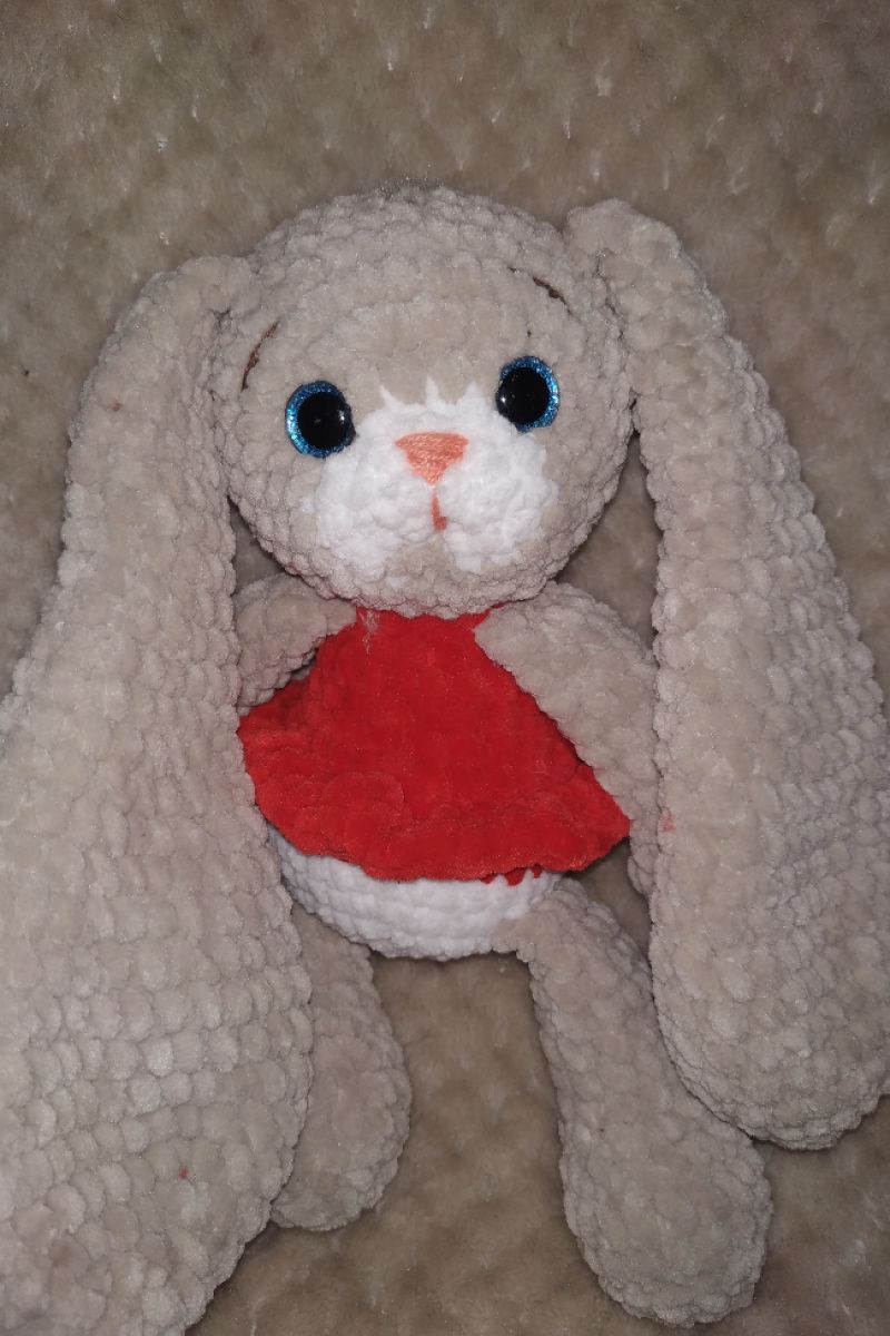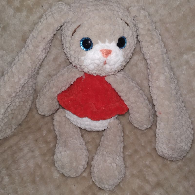 Мягкий плюшевый зайка порадует как взрослого так и ребенка. Связан из плюшевой пряжи, глазки на безопасном креплении. Размер 20 х 14 см, без учёта ушек.