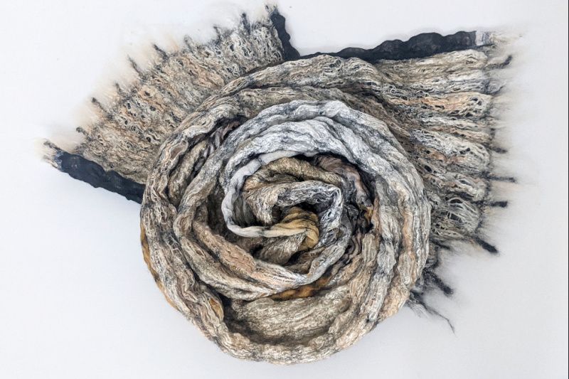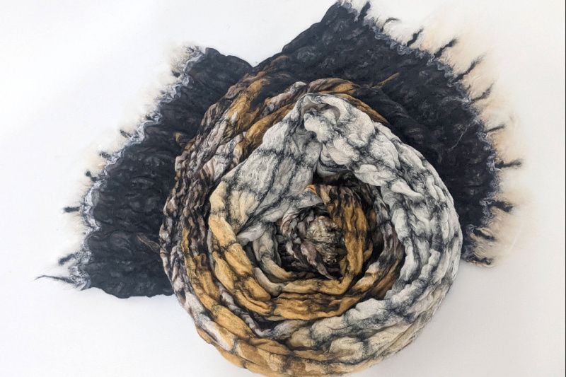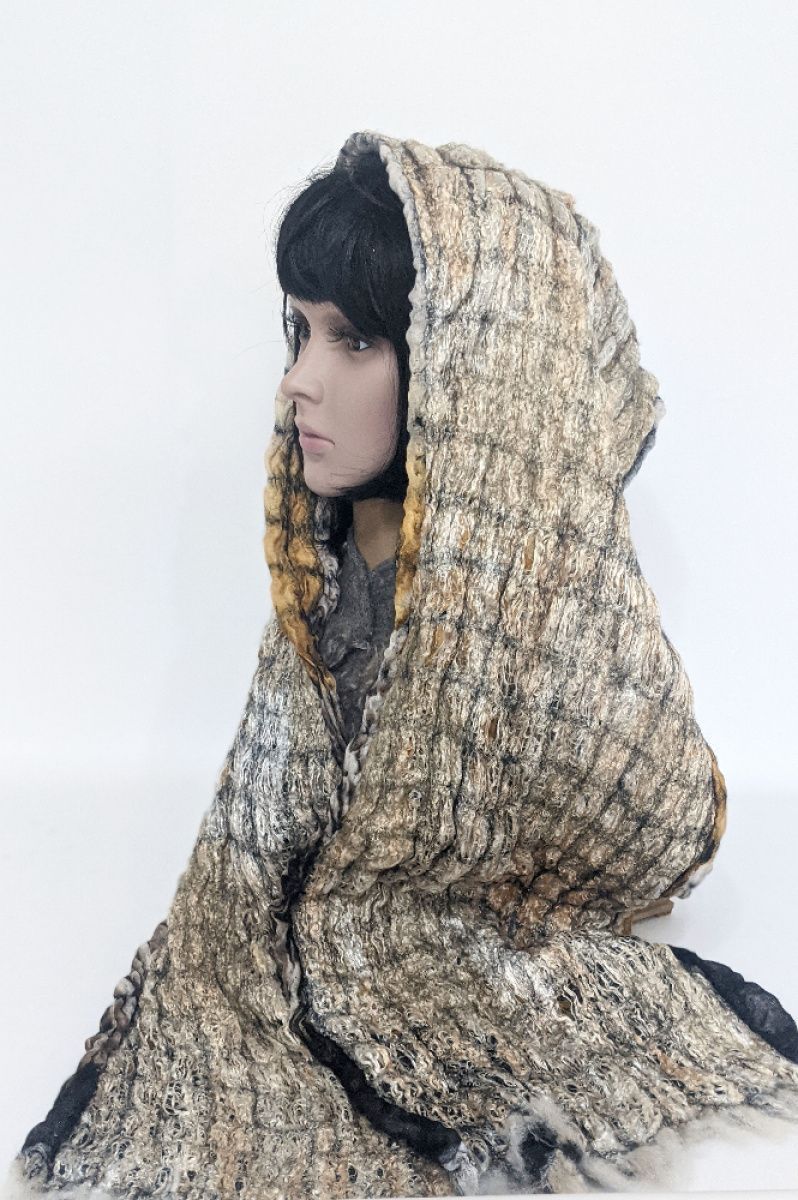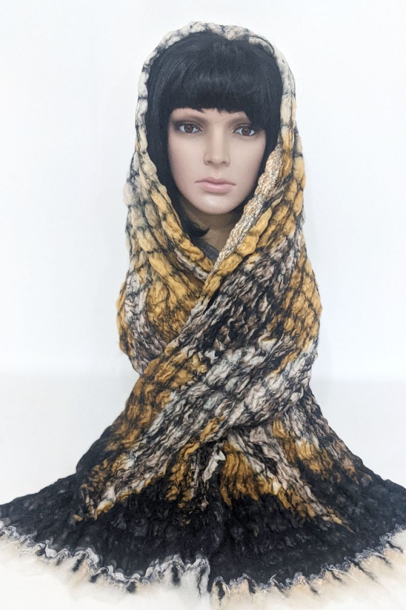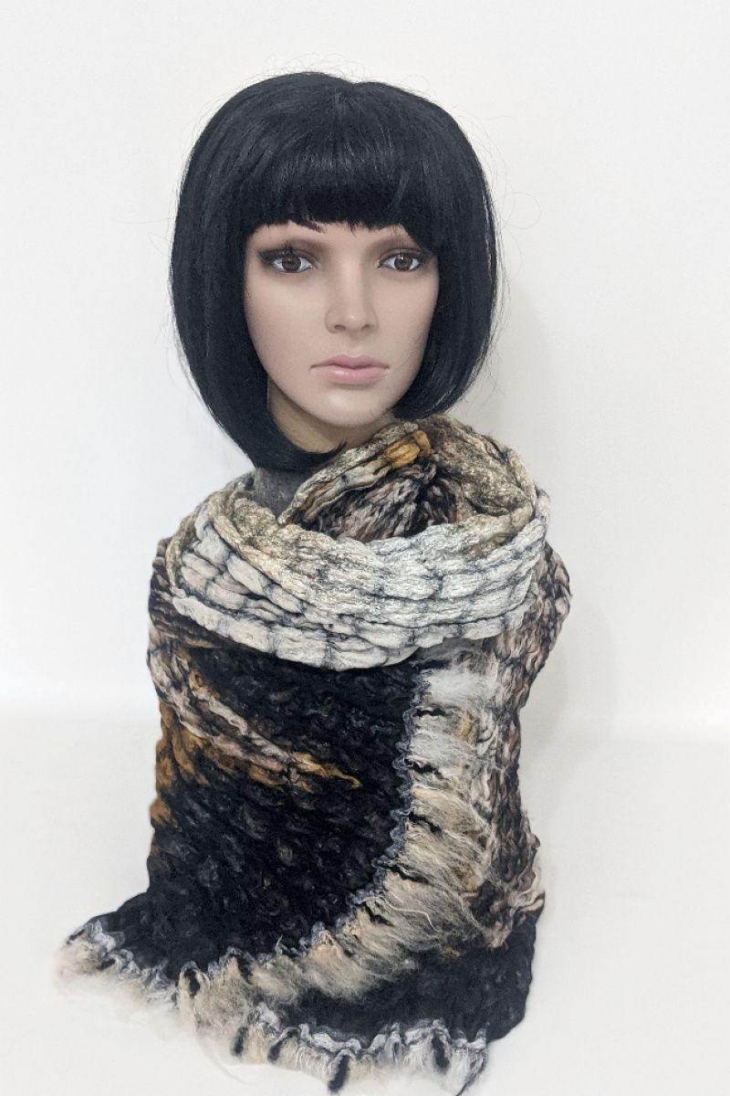 Двусторонний шарф ручной работы 'Eco Mix' 2 - это вещь, в которой все натуральное: хлопок, шерсть, растительные и шелковые волокна. Шарф теплый, мягкий, пластичный, приятный и нежный на ощупь. Свалянный шарф из мериносовой итальянской шерсти в технике мокрого валяния по авторской методике. Он, как сэндвич: на основе из хлопчатобумажной марли выложен узор из шерстяных полосок (четкий графический рисунок), которые сверху прикрыты миксом из шелковисто - вискозных волокон. Такой способ изготовления шарфа создает вещь которая "дышит"; является пластичной, приятной, теплой, интересно драпируюеться. Дело уникальная, в единственном экземпляре. Две стороны совершенно разные и по окраске, и по фактуре, и по поверхностью (матовая и блестящая). Приобретя один шарф, вы получите два .. Двусторонний шарф "Eco Mix '2 позволит создать множество интересных образов, окутает вас невесомым теплом, защитит от холодного дыхания осеннего ветра, придаст вашему образу уникальности. Размер - 180 х 28 см 100% ручная работа. Хороший подарок тепла себе, или близкому человеку!