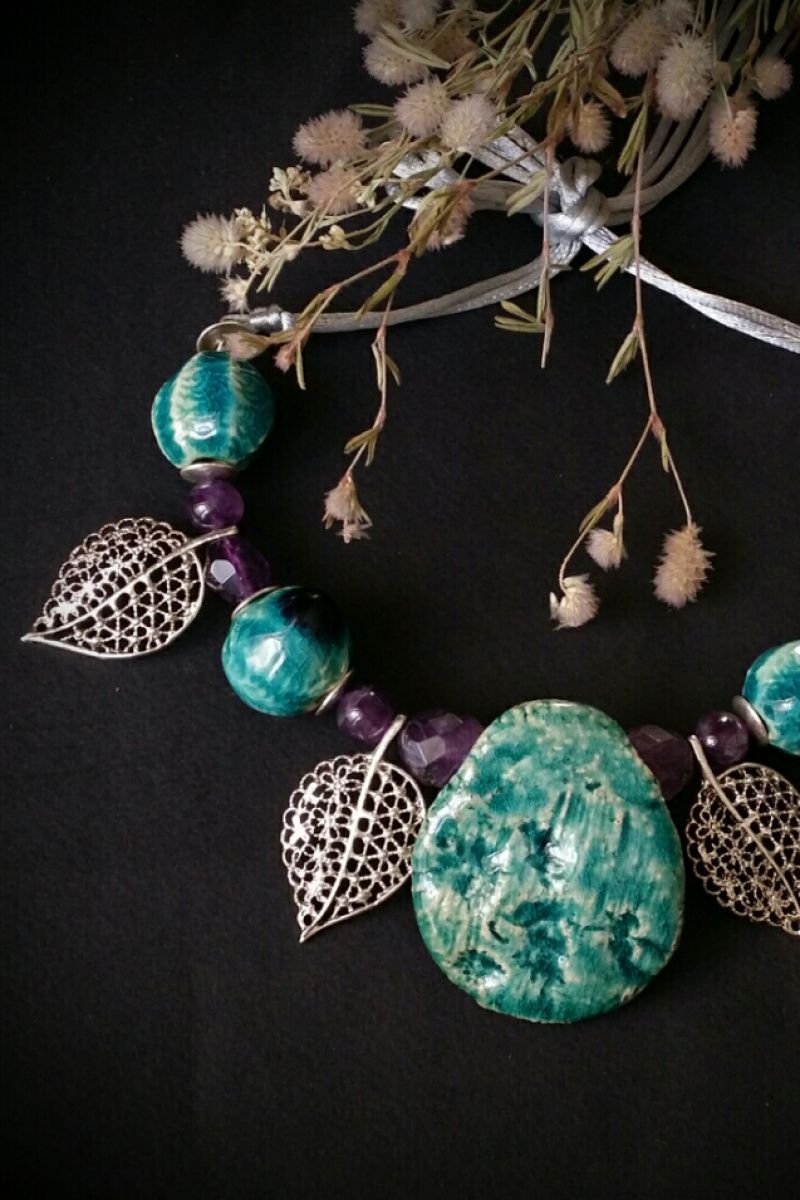 керамика ручной работы, аметист, шнур, фурнитура, проволока с памятью формы Декоративная часть 20 см. Общая длина 90 см. Кулон 5,1 \ 4,5 см. Наибольшие бусины 2,4 см.