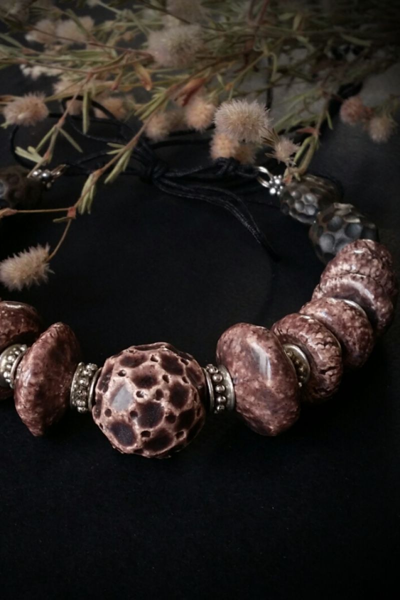 керамика ручной работы, шнур, проволока с памятью формы, фурнитура Декоративная часть 24 см. Общая длина 87 см. Самые бусины 2,5 см.