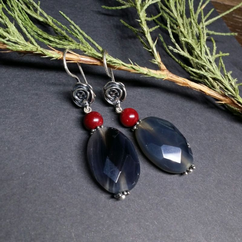 агат, тонированный коралл, серебро 925 пробы 1,6\5,3 см.