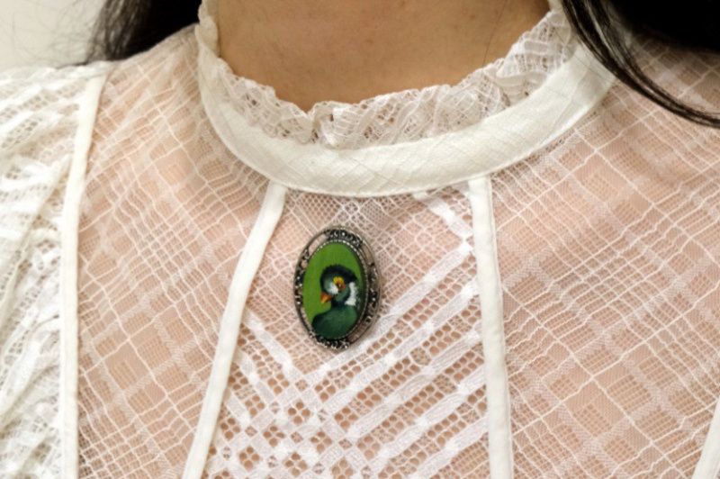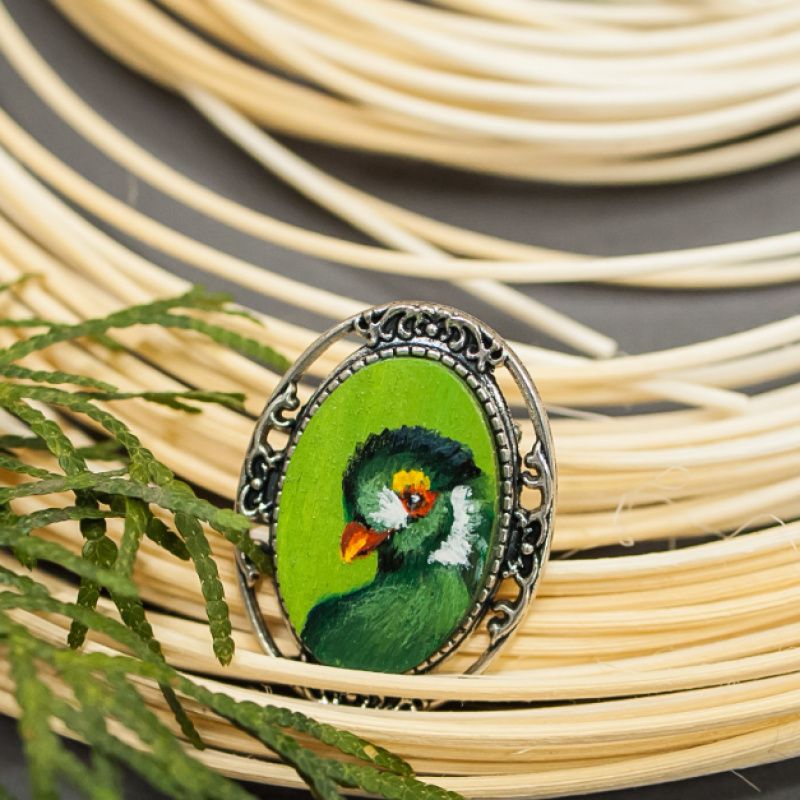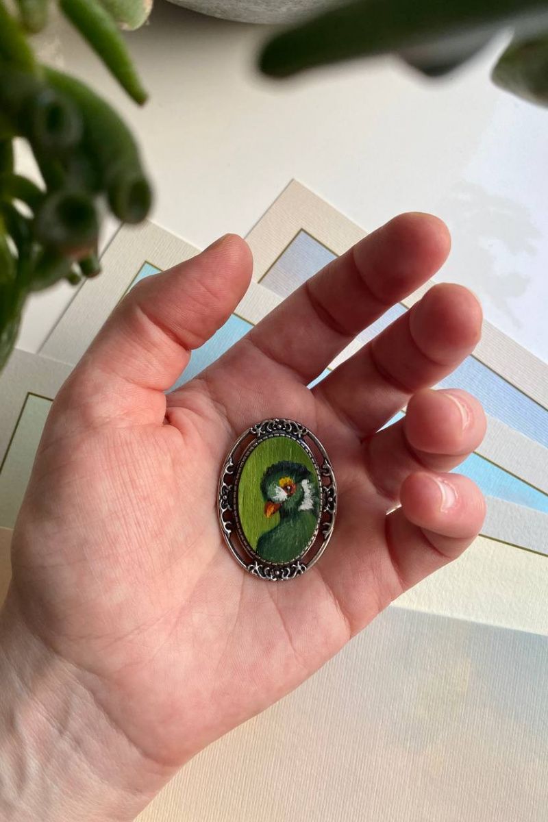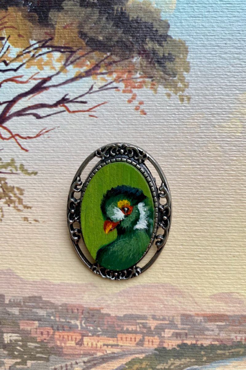 Деревянная брошь в металлической овальной оправе. На ней изображен птенчик необычайно яркой и красивой африканской птички Турако. Зеленая цветовая гамма броши может освежить любой образ ее обладательницы. Роспись выполнена акриловыми красками на деревянной основе. Несколько раз покрыта лаком для устойчивости, сохранения и хорошего вида изделия.