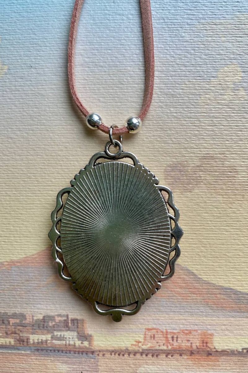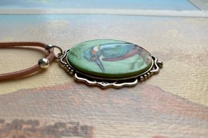Изящный дервянный кулон в металлической овальной оправе. Роспись акрилом исполнена в технике живописная миниатюра.