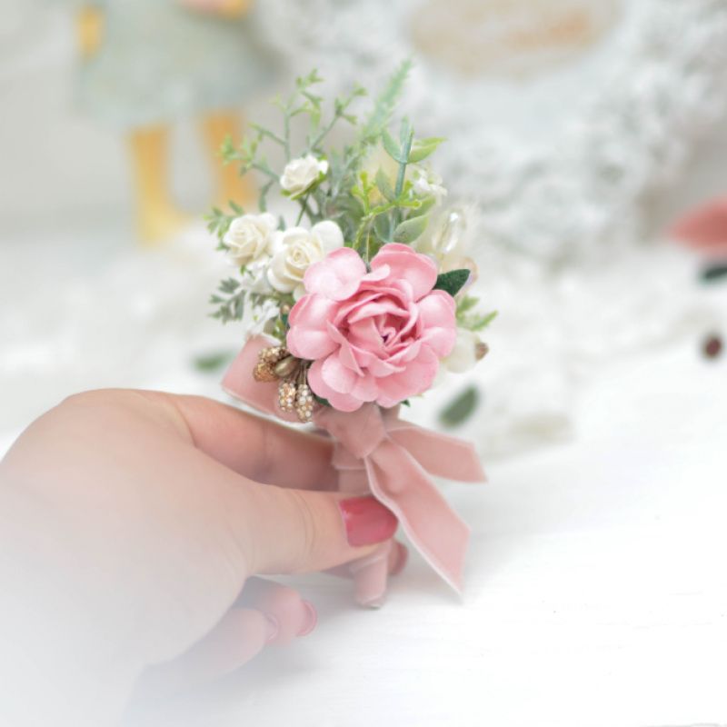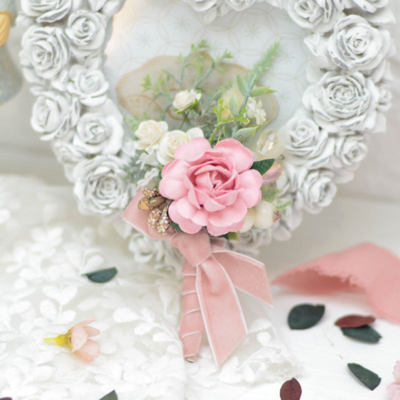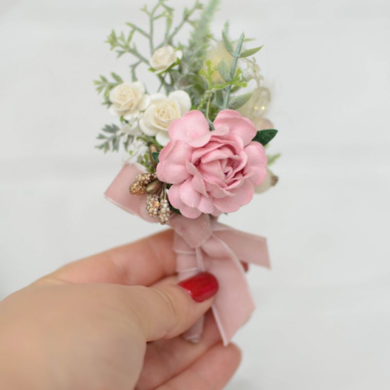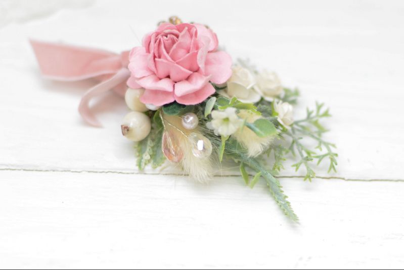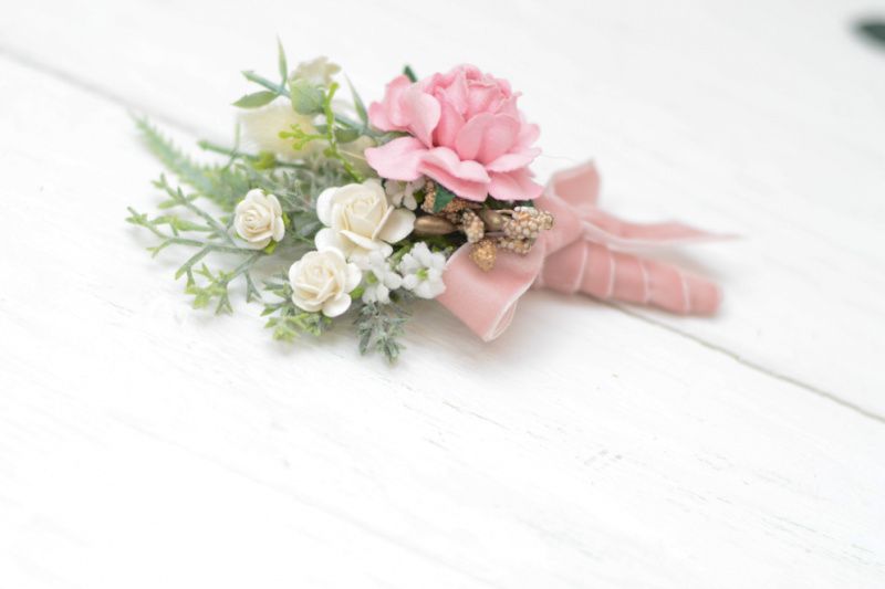 Изумительная роскошная бутоньерка с цветами, с зеленью и ягодами на бархатной ленте, размер композиции 14*6 см