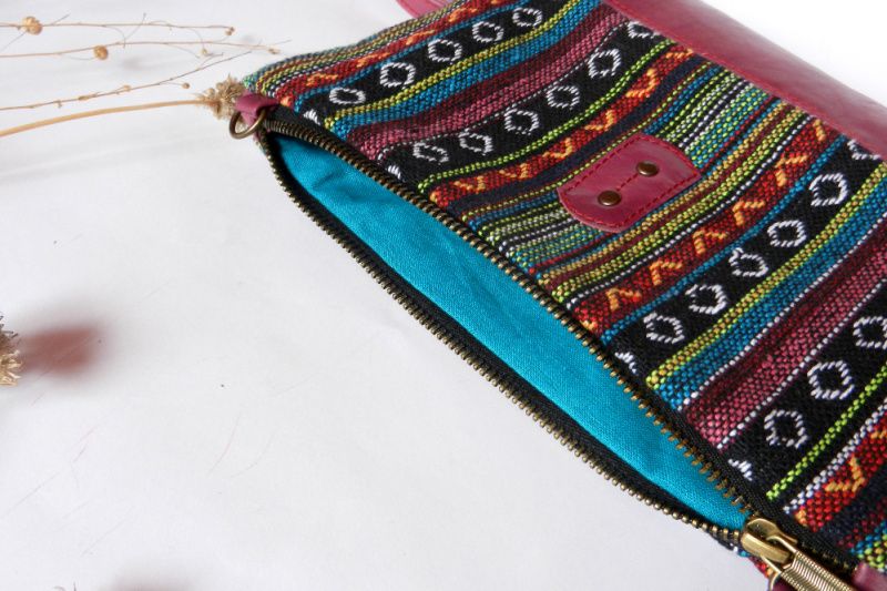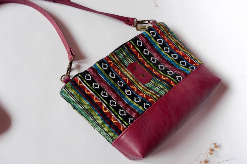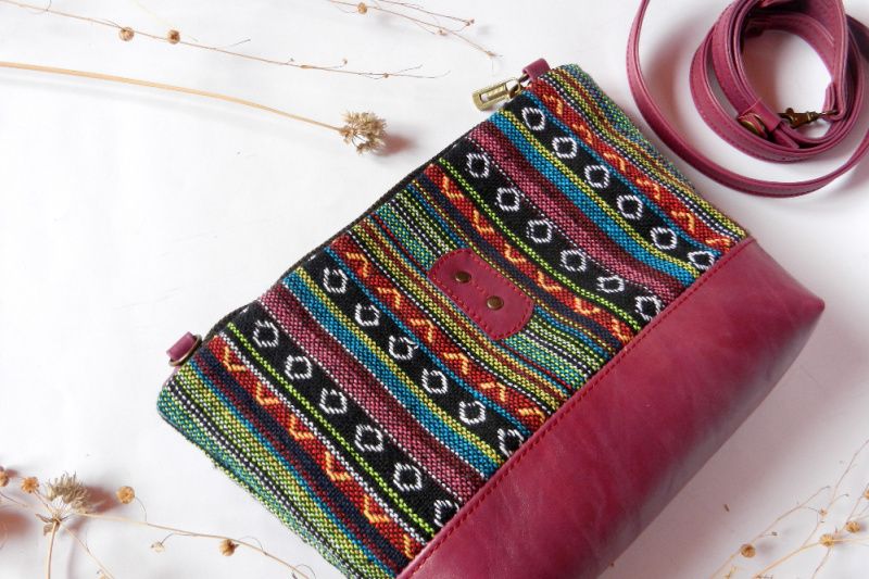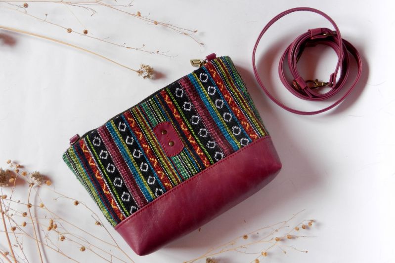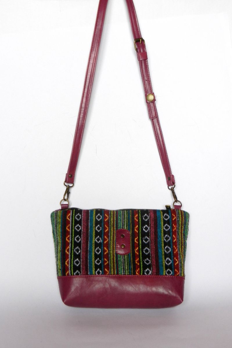 Незаменимый аксессуар на лето... Поместит только самое необходимое. Сшит из этноткани и натуральной кожи цвета красного винограда. Застёгивается на металлическую молнию. Длинный кожаный ремешок пристёгивается с помощью карабинов. Благодаря пряжке длину ремня можно регулировать.