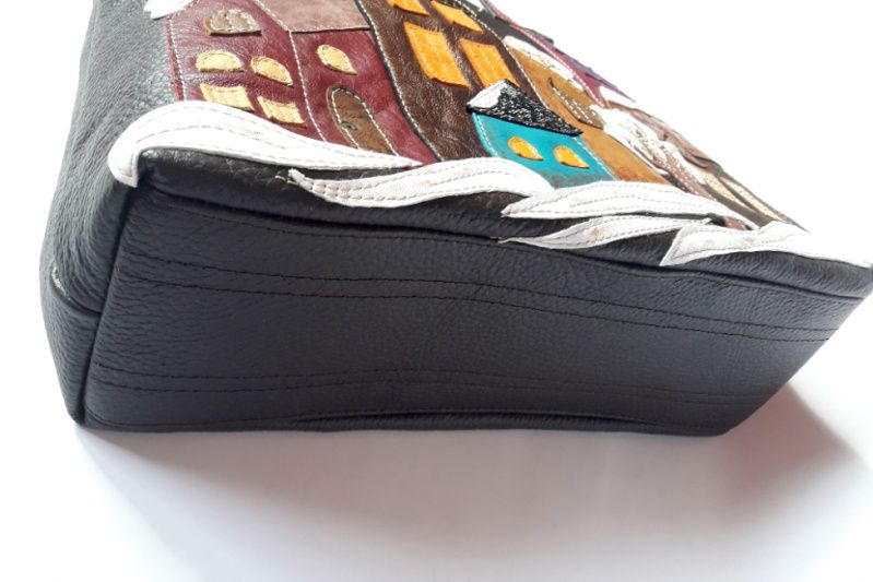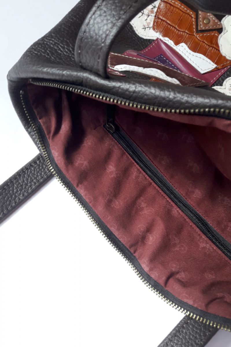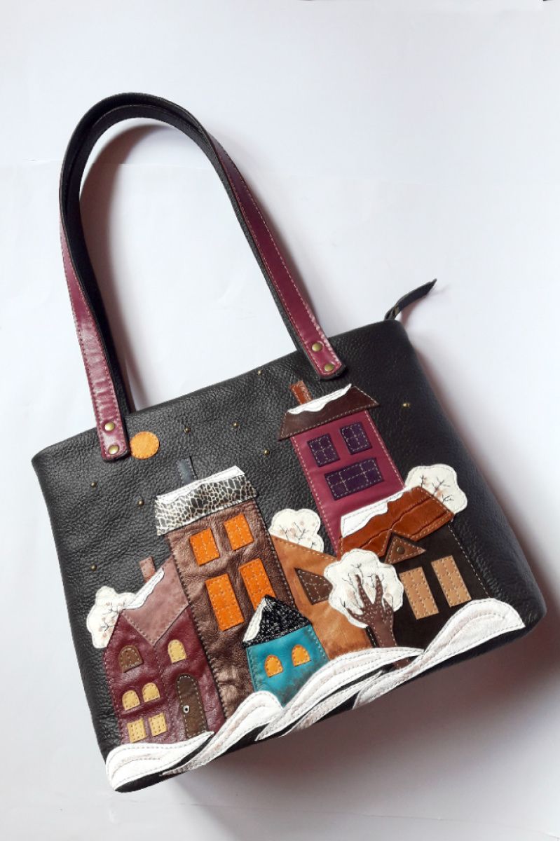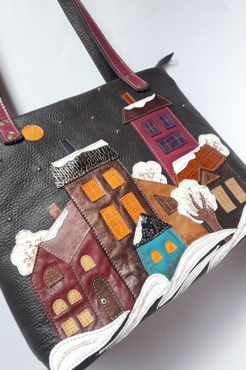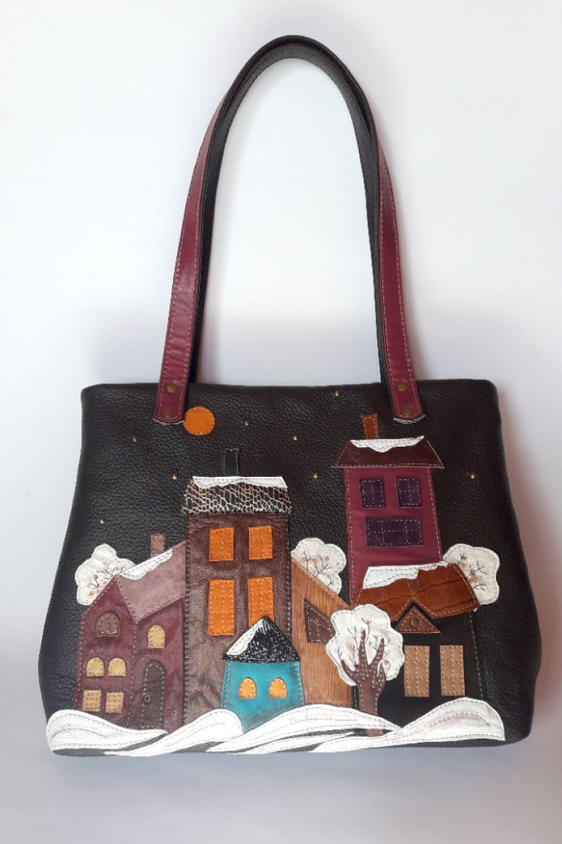 Сумка сшита из натуральной кожи темно шоколадного цвета. Аппликация из кожи и замши разных цветов и фактур. Сумка с особым зимним настроением))) Очень вместительная. Застежка – металлическая молния. Ручки достаточной длины для ношения на плече. Дно уплотнено, не провисает. Подкладка из хлопка. Внутри есть вместительный карман на молнии.