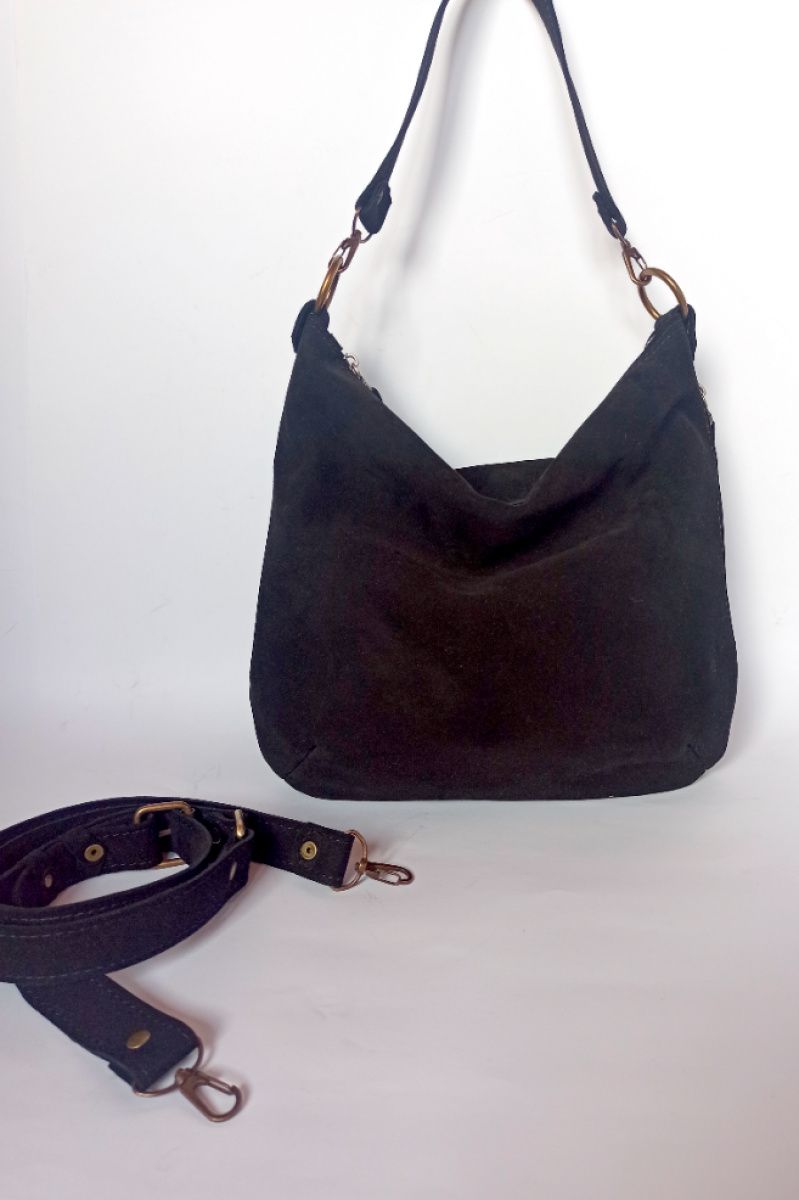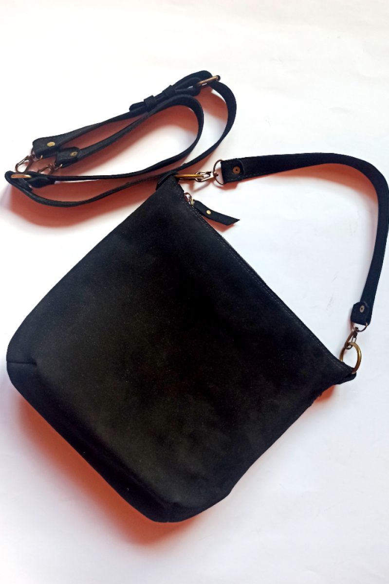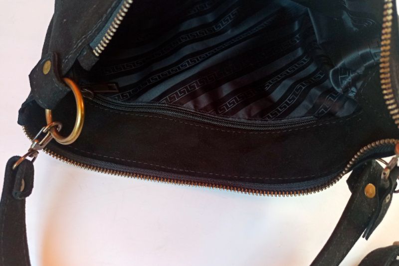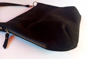 Сумка-хобо сшита из натуральной замши производства Италии. Цвет черный. Замша отличного качества мягкая и приятная на ощупь. Сумка очень легкая. Качественная фурнитура цвета антик. Застёжка – молния (очень плавная). В боковом шве есть карман на молнии. Длинный ремень регулируется с помощью пряжки. Есть короткая ручка для ношения в руке. Сумка достаточно вместительная.