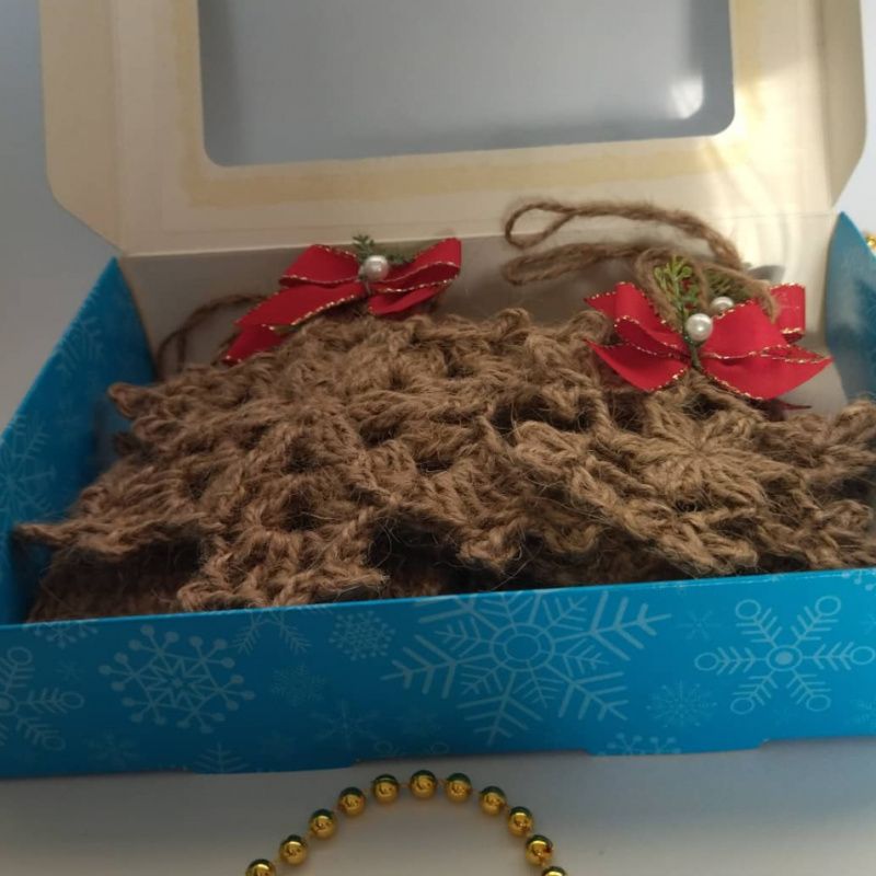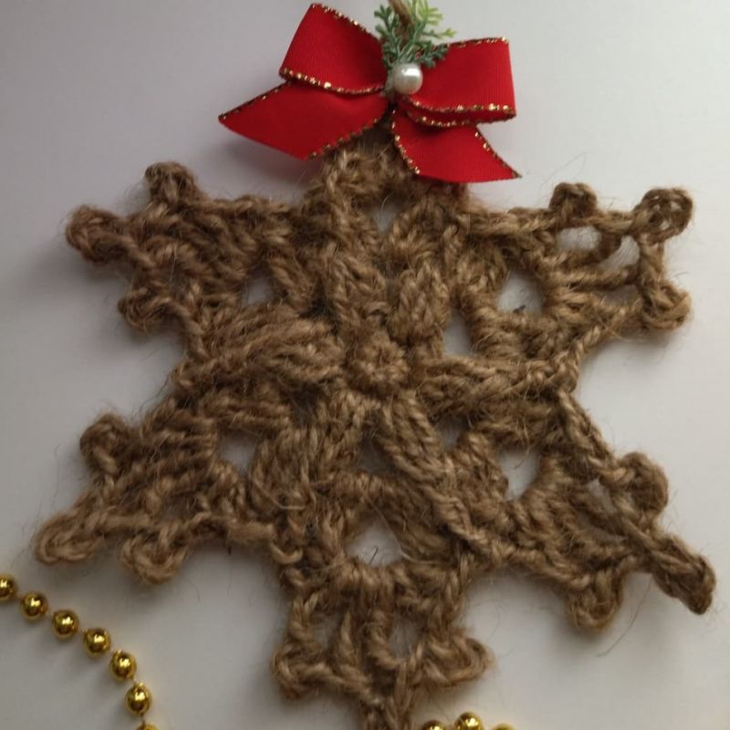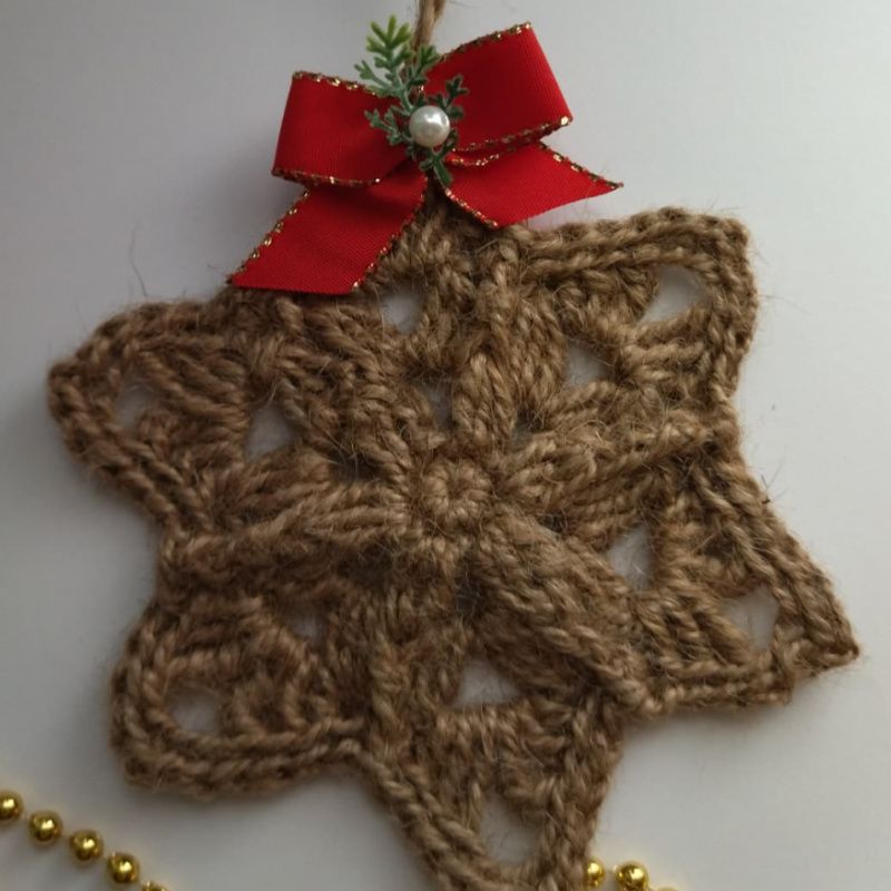 Елочные украшения изготовлены из джута. Набор из 6 украшений Большая снежинка 14см,маленькая снежинка-9см Домик и елка-11см Звезда-13см Ангелик-11см Отличный подарок для ценителей экологии, друзей, коллег или близких родственников.