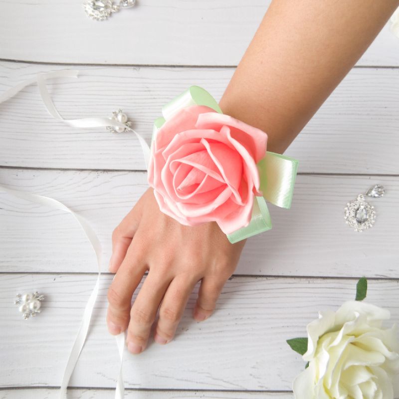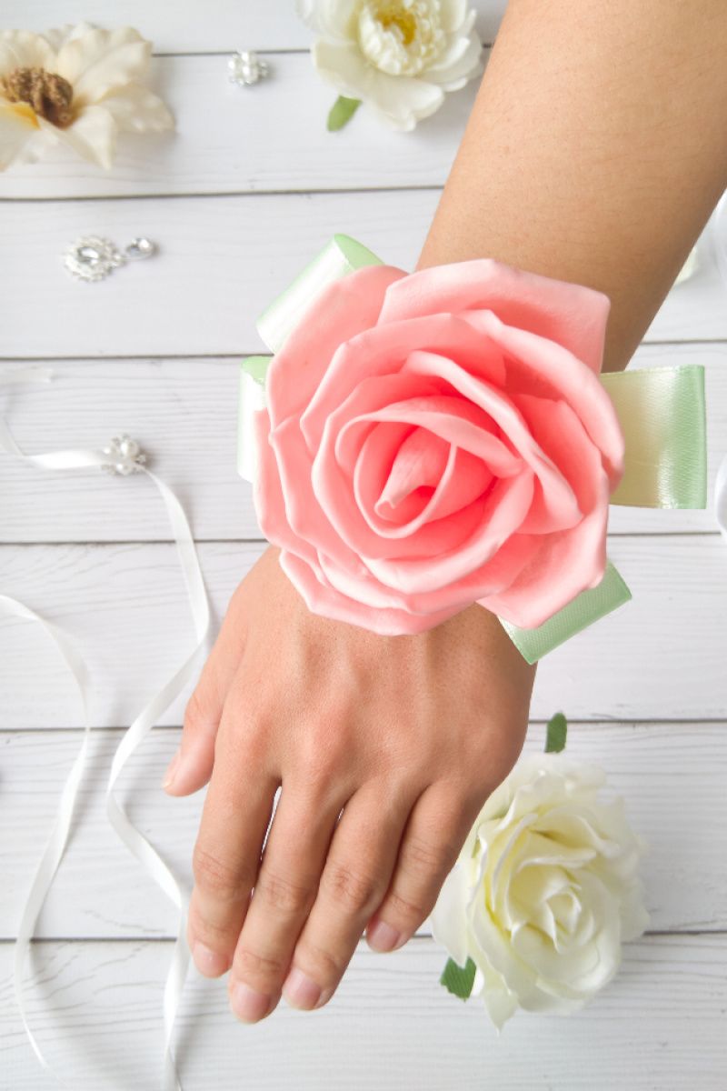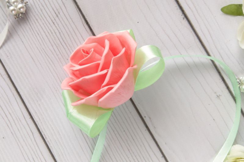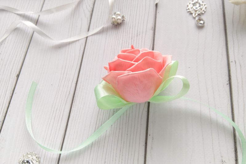 Свадебная бутоньерка, подходящих для невесты и свидетельницы (на ваше усмотрение). Полностью ручная работа. Изготовлена из фоамирану. Связывается на руку. Возможно изготовление на заказ в других цветах, а также выполнение иных свадебных атрибутов (бутоньерки для гостей, подушечка для колец, свечи, бокалы, букеты ...) Цена указана за один браслетик