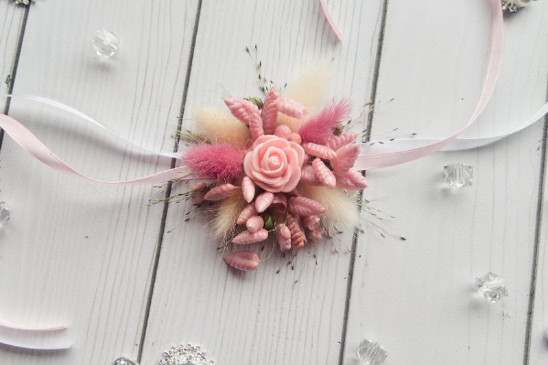 Бутоньерка из сухоцветов. Свадебная бутоньерка, подходящих для невесты и свидетельницы (на ваше усмотрение). Полностью ручная работа. Изготовлена из сухоцветов. Связывается на руку. Возможно изготовление на заказ в других цветах, а также выполнение иных свадебных атрибутов (бутоньерки для гостей, подушечка для колец, свечи, бокалы, букеты ...) Цена указана за один браслетик