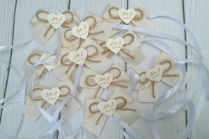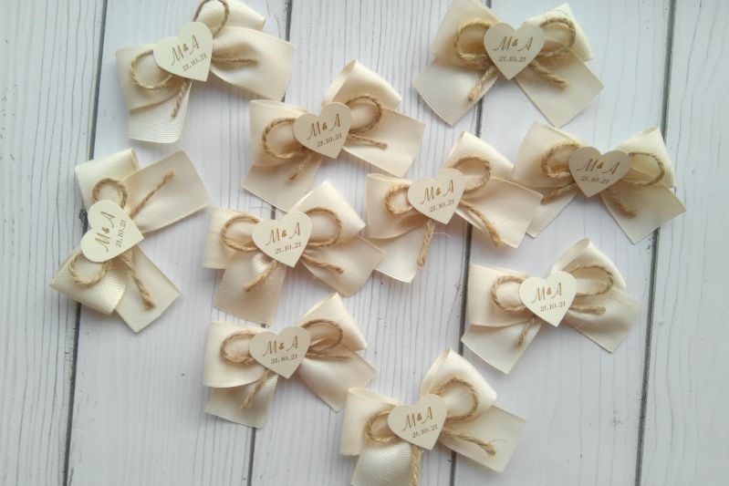 Свадебные бутоньерки для гостей, сердечко с датой свадьбы и инициалами молодых.