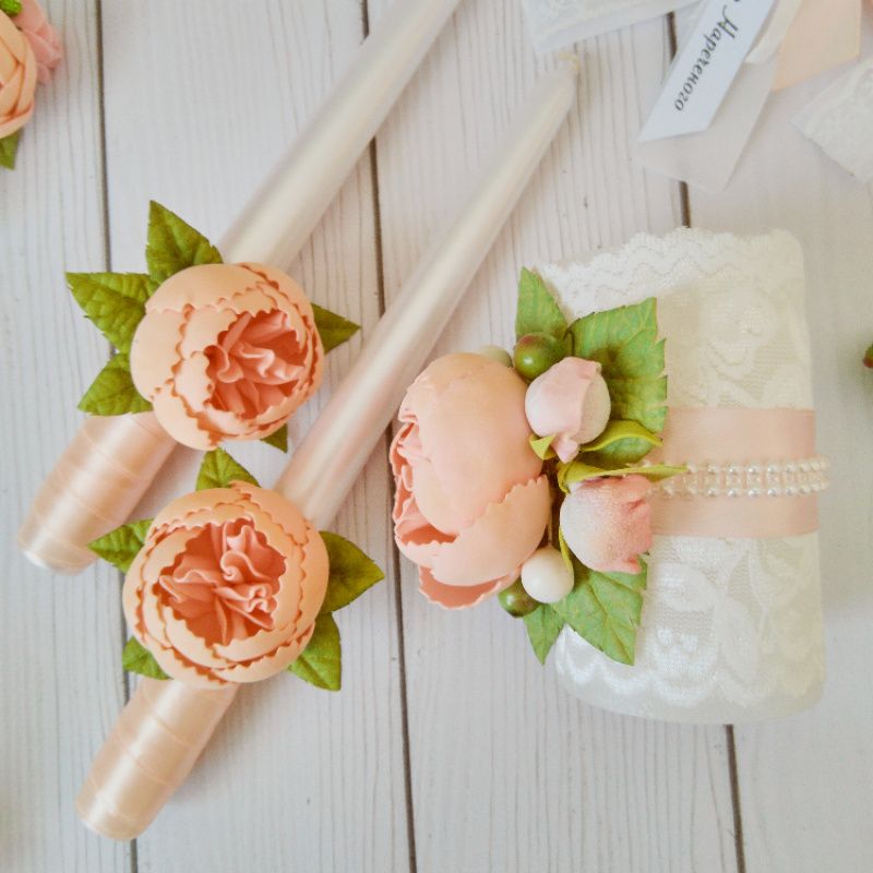 Свечи для венчания. Розового цвета. Задекорированные фоамірановими пионами ручной работы, кружевом и атласными лентами. Цена указана за пару. Возможно изготовление на заказ в любых других цветах, а также выполнение других свадебных атрибутов ( бутоньерки для невест, подвязки, подушечки, бокалы...)