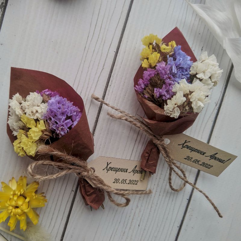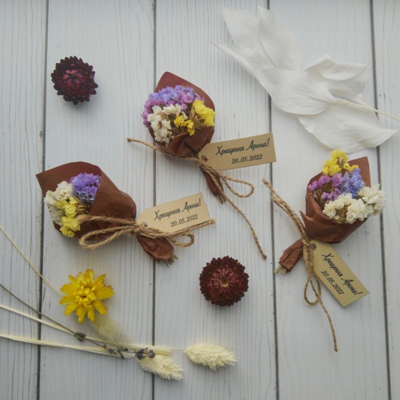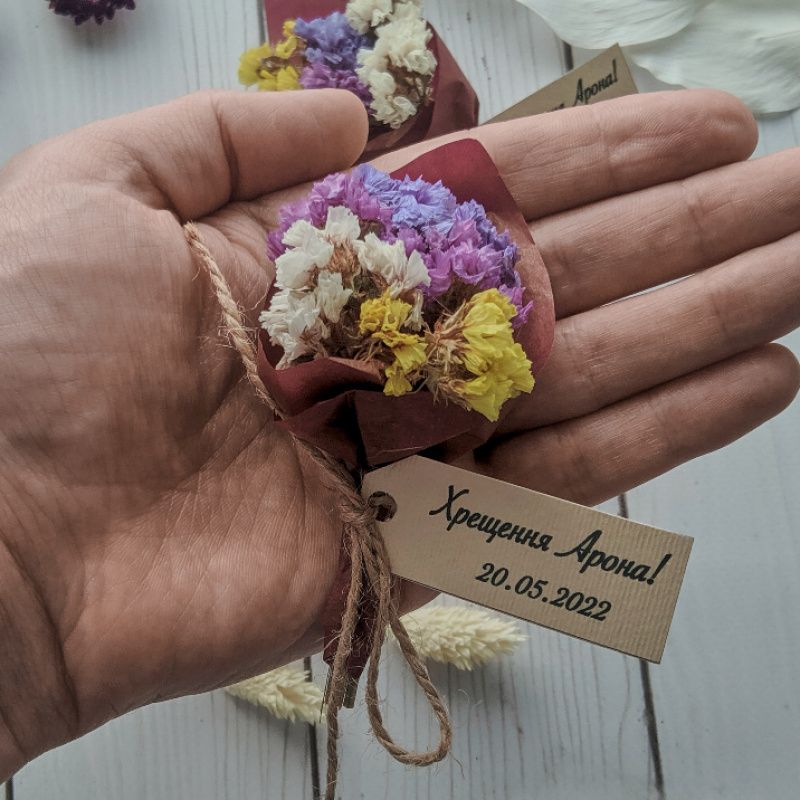 Материалы: статица сухоцвет, шпагат, дизайнерский картон (бирка), калька.