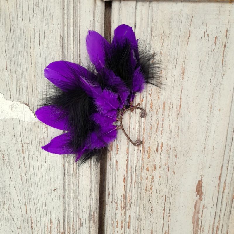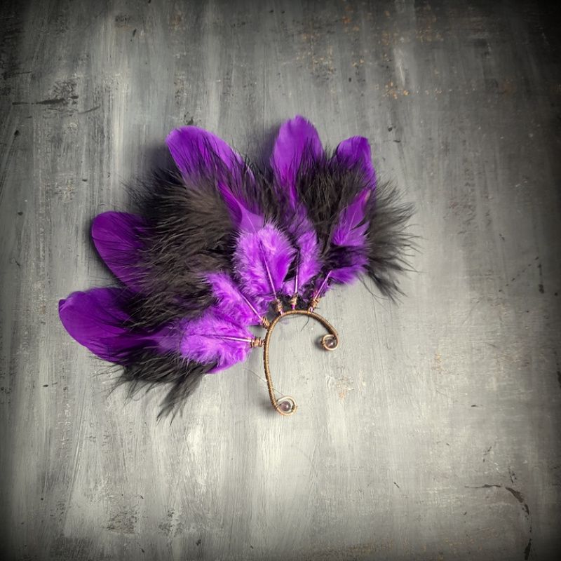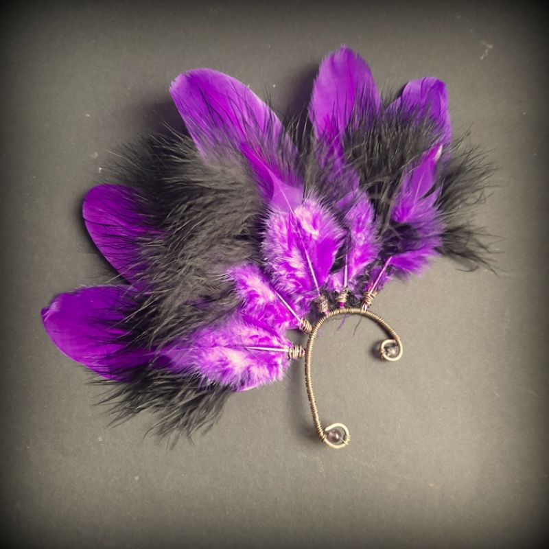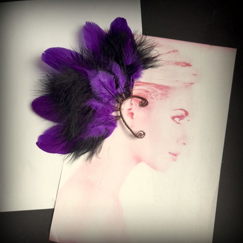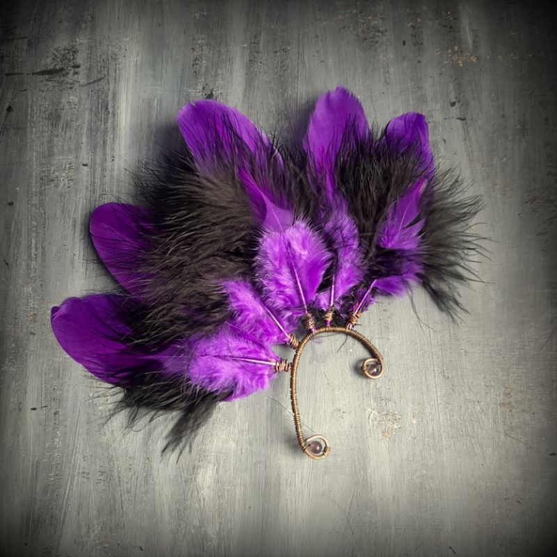 Кафф на ухо Глубокий пурпур изготовлен из медной проволоки в технике wire-wrap и украшен бусинами натурального аметиста и перьями гуся, мараба и петуха. Кафф на правое ухо. Этот яркий аксессуар из перьев подчеркнет ваш бохо образ на особом событии! Размер: высота – 18 см., ширина – 18 см. Основание из проволоки гибкое и удобно фиксируется за ухом.